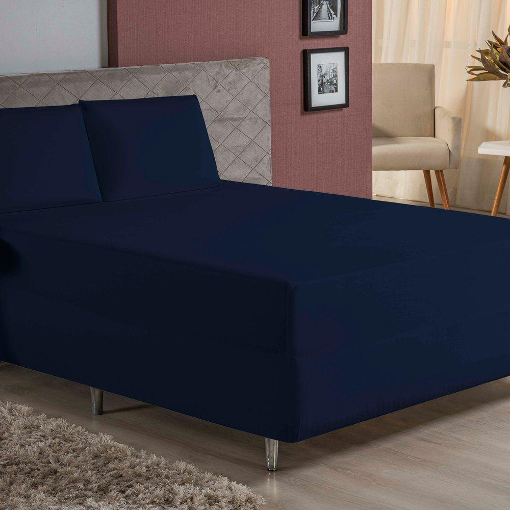 Jogo De Cama Queen Nobre 3 Peças Luva De Box 55cm De Altura Malha 100% Algodão - Azul-marinho