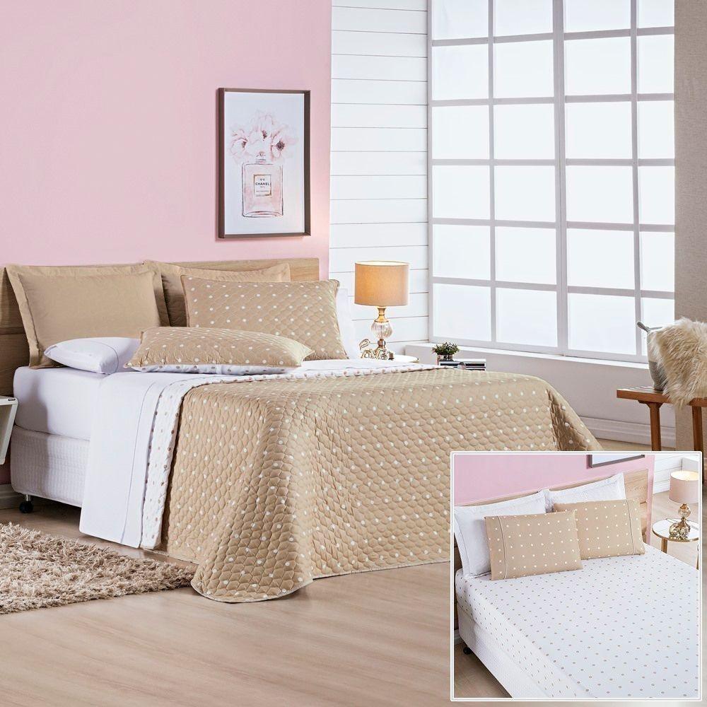 Cobre Leito + Jogo De Cama 200 Fios Petit Poá Queen 06 Peças 100% Poliéster - Caqui