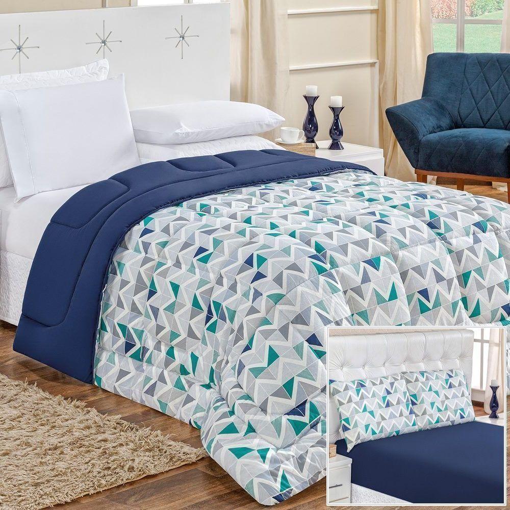 Edredom 2,60m X 2,40m + Jogo De Cama Malha Quality King 04 Peças 100% Algodão - Geométrico Azul