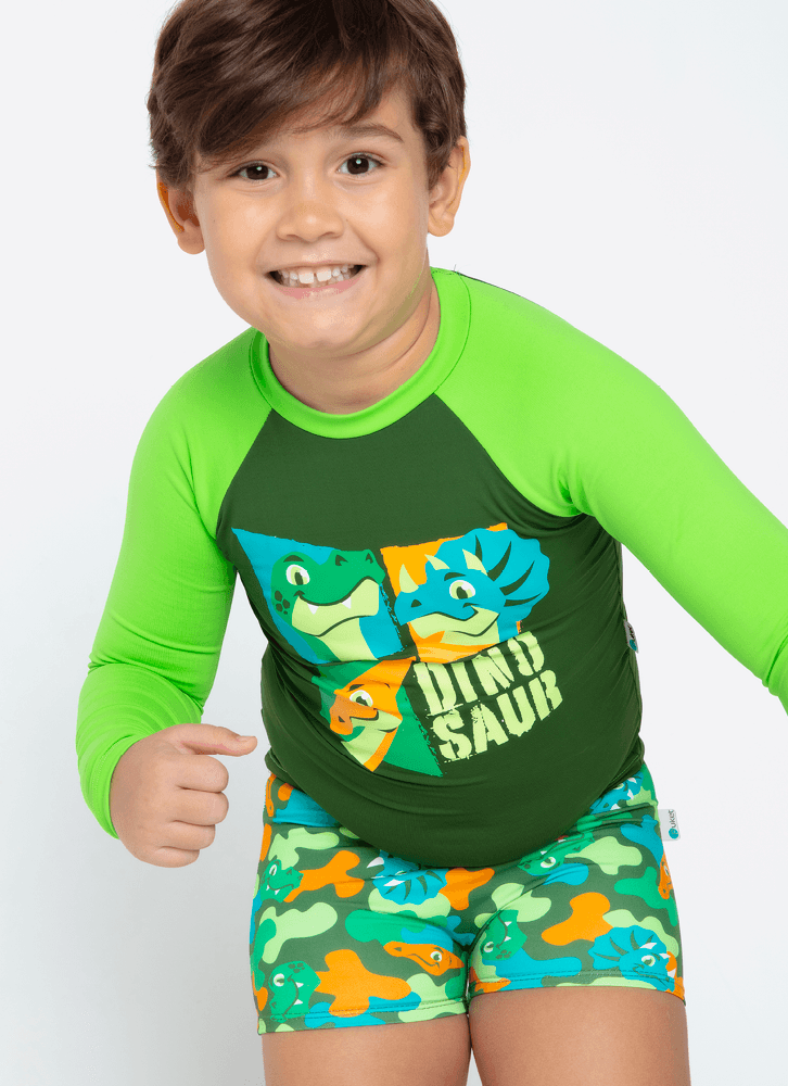 Conjunto Camiseta e Sunga com Proteção Solar Bebê Menino Dinossauro Skate