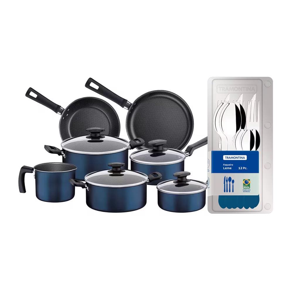 Conjunto de Panelas 7 Peças Tramontina Bergamo Antiaderente e Tampas de Vidro - Azul + Faqueiro 12 Peças Leme com Lâminas em Aço Inox - Azul