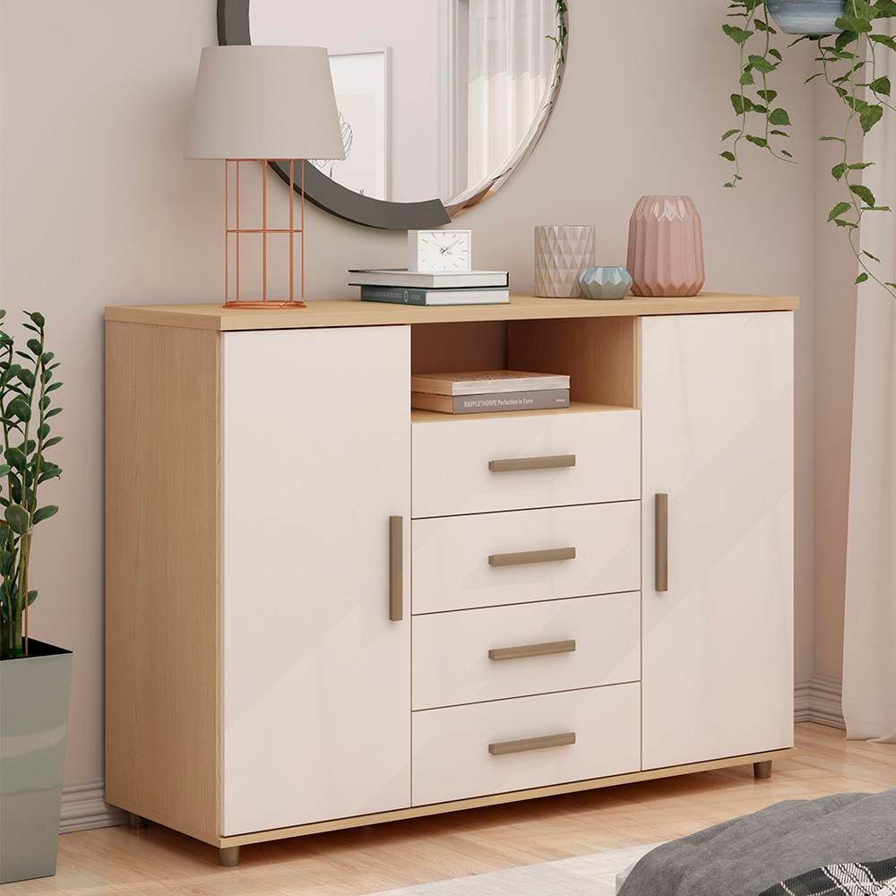Cômoda Genialflex Berlim com 2 Portas, 4 Gavetas, 2 Prateleiras, 1 Nicho e 136cm de largura - Freijó/White Laca