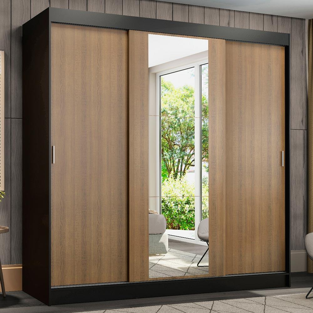 Guarda-Roupa Casal Madesa Reno 3 Portas de Correr com Espelho - Preto/Rustic