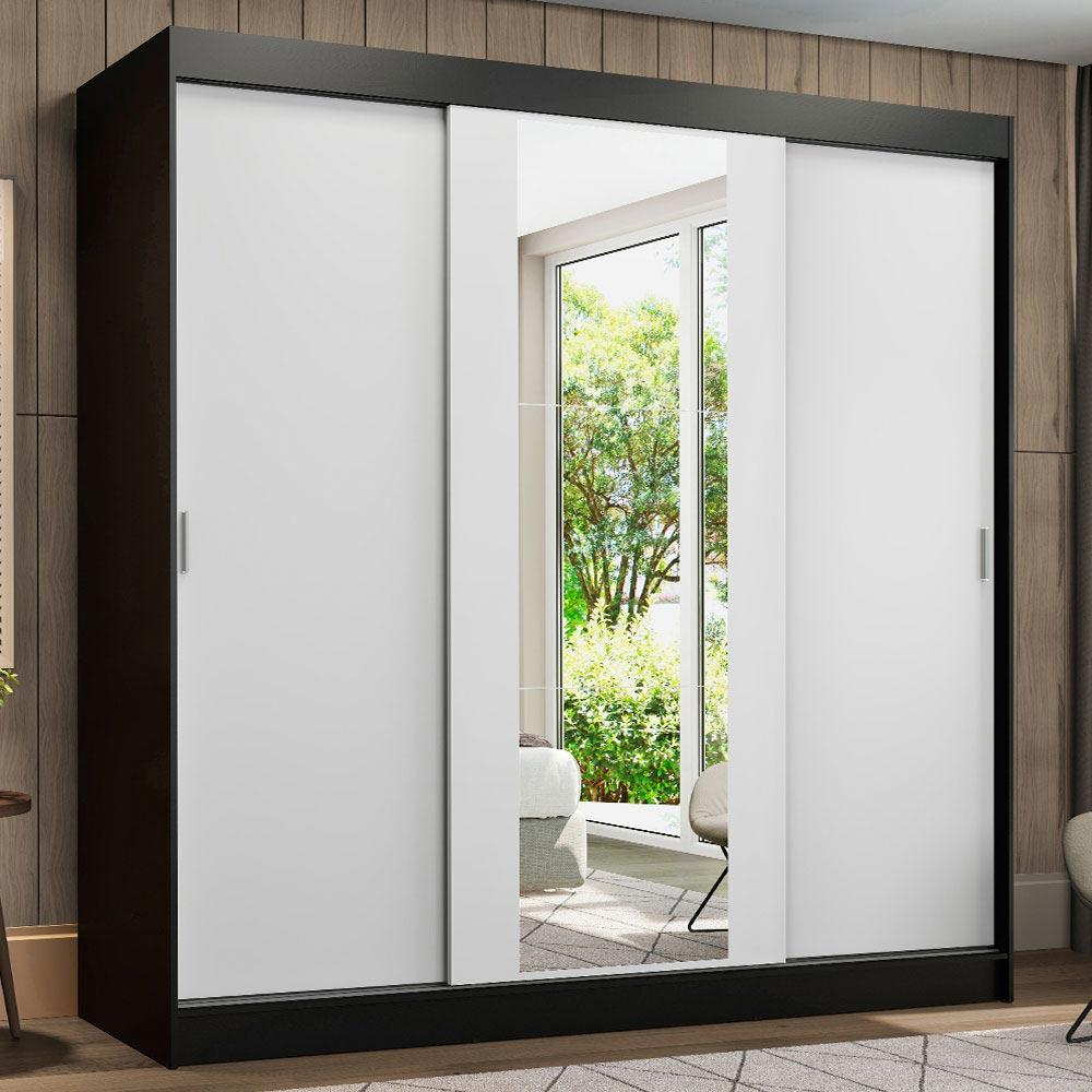 Guarda-Roupa Casal Madesa Reno 3 Portas de Correr com Espelho - Preto/Branco