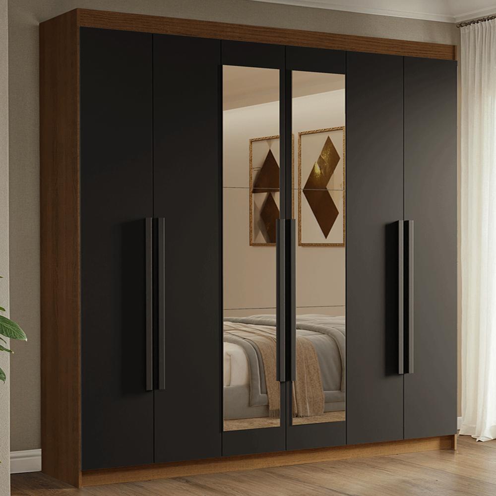 Guarda-Roupa Casal 6 Portas Batentes com Espelho Rustic/Preto/Preto Netuno Madesa
