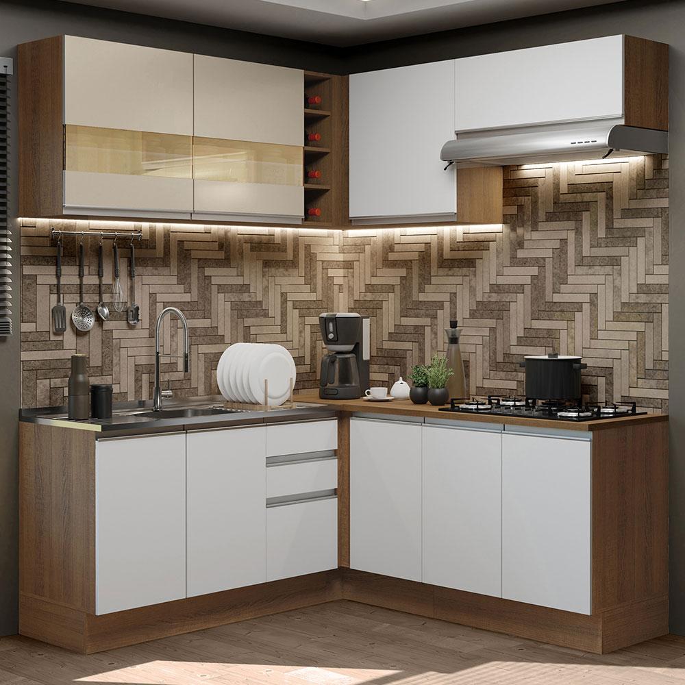 Cozinha Completa de Canto Madesa Glamy 349001 com Armário e Balcão (Sem Tampo) - Branco/Branco/Crema