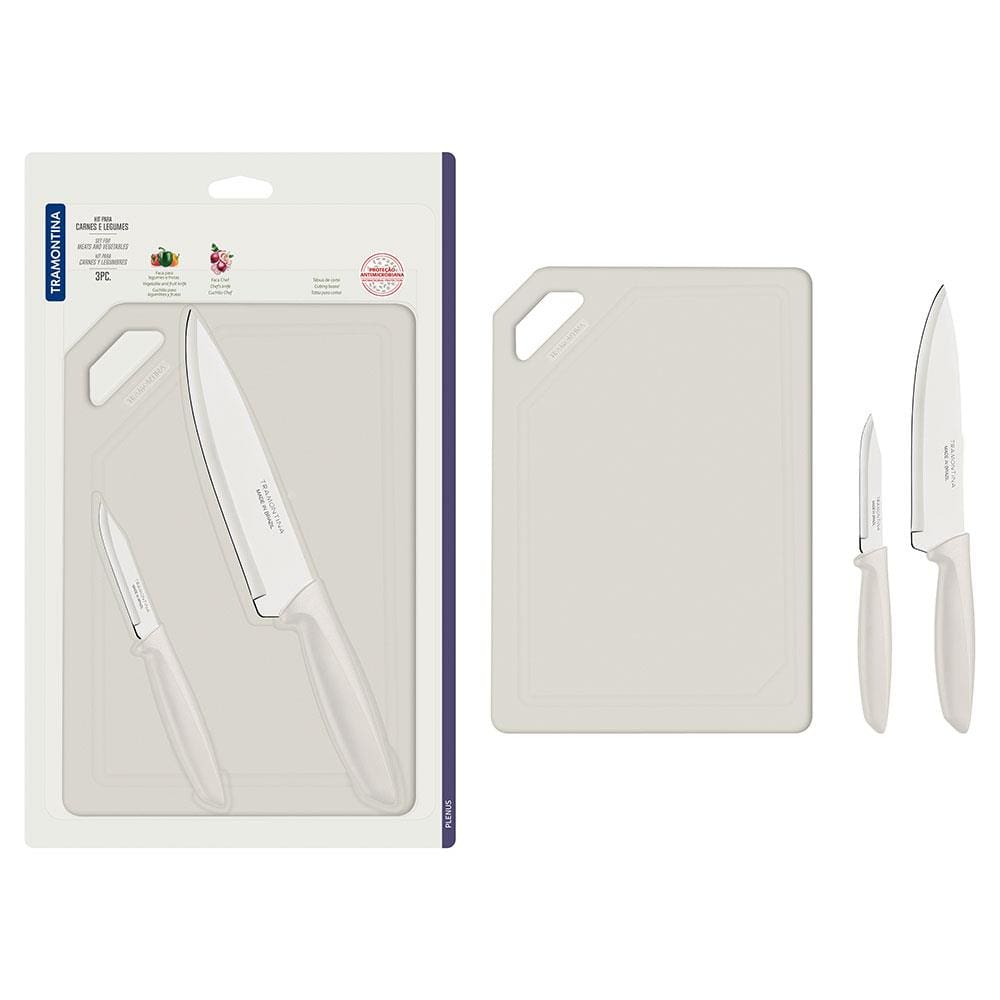 Conjunto de Facas e Tábua de Corte Tramontina Plenus em Aço Inoxidável - Off-White - 3 Peças
