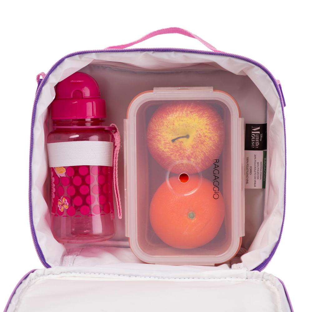 Lancheira Térmica Infantil Feminina Minnie Disney Rosa0152626560001 A Lancheira Minnie mantém seus alimentos frescos e saborosos enquanto sua filha está na escola ou em qualquer lugar. Com um design prático e funcional, esta lancheira térmica oferece uma maneira divertida de levar as refeições diárias dos pequenos. Tamanhos disponível: 25 x 21 x 12cm Principais Atributos Alça Mão Com a Alça para mão é possível você carregar a lancheira com maior facilidade. Bolso Frontal A lancheira conta com um amplo bolso frontal externo para acomodar itens para fácil acesso. Proteção térmica Projetada para mantér a temperatura de seus alimentos e bebidas por muito mais tempo, a proteção térmica é ideal para quem tem um rotina agitada na rua e prefere carregar sua própria comida. Diferenciais Alça transversal Conta com alça transversal, sendo possível carregar a lancheira no ombro, com maior facilidade.p> Bagaggio responde Essa lancheira da Bagaggio tem garantia? Sim, a lancheira conta com 90 dias de garantia para defeitos de fábrica. Qual litragem essa lancheira comporta? A lancheira comporta até 6,3L. Quanto pesa esta lancheira? A lancheira conta com um peso de 360g.