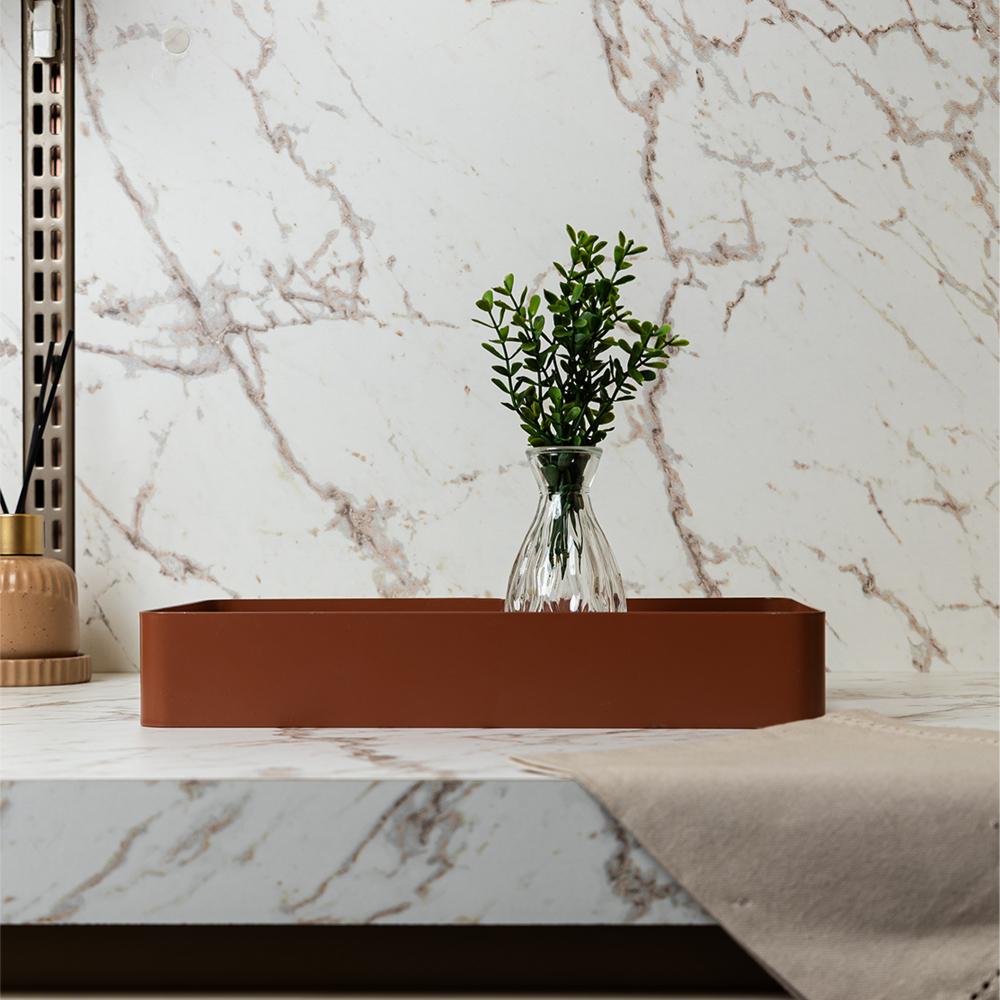Bandeja Fundo de Madeira Virelli 30 x 20 x 5cm Marrom MetalBandeja com Fundo de Madeira Virelli 30cm x 20cm x 5cm Marrom Metal - LyorBandeja com Fundo de Madeira Virelli 30cm x 20cm x 5cm Marrom Metal - LyorUm toque de sobriedade e estilo para organizar seus espaços. A Bandeja Virelli com estrutura em metal marrom e fundo de madeira é uma peça robusta e elegante, ideal para compor decorações com personalidade.•?????Combinação de tons quentesA estrutura em metal marrom junto com a madeira cria uma peça com visual aconchegante e um toque de estilo industrial.•?????Ideal para organizar a sala de estarPerfeita para ser usada sobre um pufe ou mesa de centro, organizando controles remotos, velas e livros.•?????Base firme para servirA estrutura de metal e o fundo de madeira garantem estabilidade para levar bebidas ou petiscos com segurança.•?????Atrai o público de decoração masculinaSeus tons sóbrios e materiais robustos a tornam uma excelente opção para o mix de produtos com apelo ao público masculino.LyorSoluções completas para o seu lar.Contém: 1 BandejaMedidas Produto: Altura 5,00cm x Largura 15,00cm x Comprimento 25,00cmPeso: 0,62KgLimpar com flanela branca e seca. Não utilizar produtos químicos.