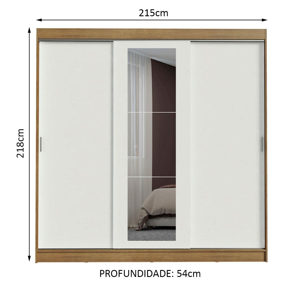 O Guarda-Roupa Kansas da Madesa possui três portas de correr com deslizamento suave, trilhos em alumínio para maior resistência e dois puxadores externos. Uma das portas possui o diferencial dos espelhos, que são muito úteis no uso diário.O tamanho é pensado especialmente para a necessidade de um casal. A divisão interna é ótima, com muitas prateleiras e nichos, além de três gavetas espaçosas com corrediças metálicas, muito mais seguras e resistentes.Os dois cabideiros são em alumínio e possuem espaços tanto para roupas curtas quanto mais longas. Ou seja, tem lugar pra organizar tudo: roupas, calçados, malas, travesseiros, edredons e muito mais.O acabamento combina os tons amadeirado Rustic e branco. É feito com a Pintura Poliéster de 7 camadas exclusiva da Madesa, um método ecologicamente correto e que traz mais proteção ao móvel.Medidas totais do móvel: 218 cm de altura x 215 cm de largura x 54 cm de profundidade.As imagens são meramente ilustrativas.Itens inclusos:- Três (3) portas de correr com sistema anti-descarrilhamento, sendo uma delas com espelhos- Dois (2) puxadores em PVC- Três (3) gavetas internas com corrediças metálicas- Dois (2) cabideiros em alumínioCódigo do produto: 10186E1EObs.: A Madesa não disponibiliza serviço de montagem. A embalagem acompanha as ferragens necessárias e o manual com todos os passos para a instalação do produto.1 – O produto é novo ou usado?R.: Todos os produtos da Madesa são novos, enviados da nossa fábrica diretamente para as casas de nossos clientes.2 – O produto vem montado? Se não, vocês realizam a montagem?R.: A Madesa não disponibiliza serviço de montagem. Todos os produtos seguem com manual de instalação e as ferragens necessárias. Alguns produtos possuem vídeo explicando o passo a passo da montagem.3 – Vocês possuem loja física? Posso retirar meu produto em mãos?R.: Não possuímos loja física, apenas loja virtual. Confira as opções de envio ao colocar o seu CEP.4 – Qual é o valor do envio? Posso pagar separadamente?R.: O valor do envio é calculado com base no peso e volume do produto, e no CEP de destino. Você pode calcular o valor e prazo de entrega no simulador.5 – A Madesa entrega em todo Brasil? Como é feita a entrega?R.: Sim, entregamos no Brasil inteiro através de transportadoras parceiras.6 – O produto acompanha Nota Fiscal?R.: Sim, todos os produtos são entregues com suas respectivas notas fiscais.7 – Os produtos possuem garantia?R.: Sim. A Madesa oferece 3 meses de garantia para defeitos de fabricação.A Madesa se dedica à sustentabilidade com várias iniciativas: temos uma usina própria para gerar energia que abastece uma de nossas fábricas. Selecionamos nossos fornecedores, priorizando aqueles que possuem um compromisso com a sustentabilidade e proteção do meio ambiente. Todo o plástico utilizado no setor produtivo é proveniente de reciclagem e as suas sobras são encaminhadas ao fornecedor que os recicla. Também investimos no desenvolvimento contínuo de nossos colaboradores e em ações educacionais que beneficiem a comunidade.