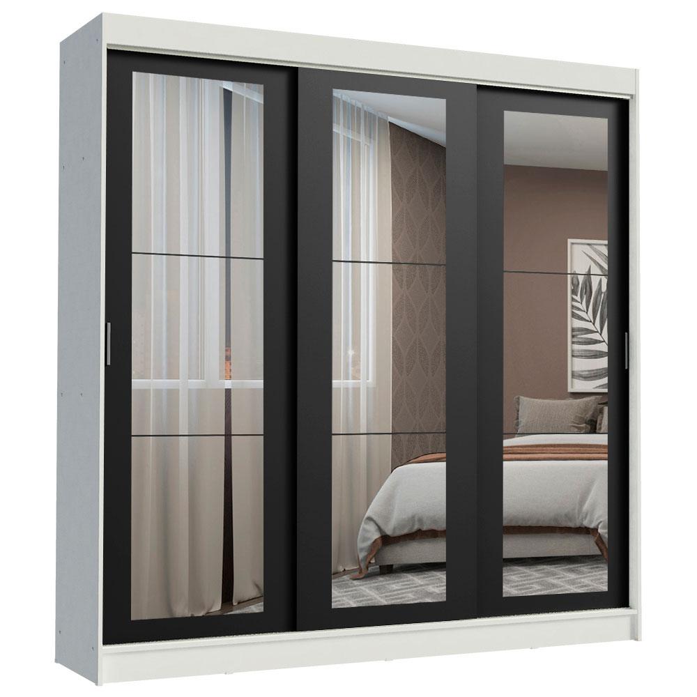 O Guarda-Roupa Kansas da Madesa possui três portas de correr com deslizamento suave, trilhos em alumínio para maior resistência e dois puxadores externos. Além disso, todas as portas possuem espelhos, que deixam o móvel muito mais bonito e ampliam o ambiente.O tamanho é pensado especialmente para a necessidade de um casal. A divisão interna é ótima, com muitas prateleiras e nichos, além de três gavetas espaçosas com corrediças metálicas, muito mais seguras e resistentes.Os dois cabideiros são em alumínio e possuem espaços tanto para roupas curtas quanto mais longas. Ou seja, tem lugar pra organizar tudo: roupas, calçados, malas, travesseiros, edredons e muito mais.O acabamento é todo branco, com exceção das portas, que são pretas. É feito com a Pintura Poliéster de 7 camadas exclusiva da Madesa, um processo ecologicamente correto e que conserva o móvel por muito mais tempo.Medidas totais do móvel: 218 cm de altura x 215 cm de largura x 54 cm de profundidade.As imagens são meramente ilustrativas.Itens inclusos:- Três (3) portas de correr com sistema anti-descarrilhamento, todas com espelhos- Dois (2) puxadores em PVC- Três (3) gavetas internas com corrediças metálicas- Dois (2) cabideiros em alumínioCódigo do produto: 1018733EObs.: A Madesa não disponibiliza serviço de montagem. A embalagem acompanha as ferragens necessárias e o manual com todos os passos para a instalação do produto.1 – O produto é novo ou usado?R.: Todos os produtos da Madesa são novos, enviados da nossa fábrica diretamente para as casas de nossos clientes.2 – O produto vem montado? Se não, vocês realizam a montagem?R.: A Madesa não disponibiliza serviço de montagem. Todos os produtos seguem com manual de instalação e as ferragens necessárias. Alguns produtos possuem vídeo explicando o passo a passo da montagem.3 – Vocês possuem loja física? Posso retirar meu produto em mãos?R.: Não possuímos loja física, apenas loja virtual. Confira as opções de envio ao colocar o seu CEP.4 – Qual é o valor do envio? Posso pagar separadamente?R.: O valor do envio é calculado com base no peso e volume do produto, e no CEP de destino. Você pode calcular o valor e prazo de entrega no simulador.5 – A Madesa entrega em todo Brasil? Como é feita a entrega?R.: Sim, entregamos no Brasil inteiro através de transportadoras parceiras.6 – O produto acompanha Nota Fiscal?R.: Sim, todos os produtos são entregues com suas respectivas notas fiscais.7 – Os produtos possuem garantia?R.: Sim. A Madesa oferece 3 meses de garantia para defeitos de fabricação.A Madesa se dedica à sustentabilidade com várias iniciativas: temos uma usina própria para gerar energia que abastece uma de nossas fábricas. Selecionamos nossos fornecedores, priorizando aqueles que possuem um compromisso com a sustentabilidade e proteção do meio ambiente. Todo o plástico utilizado no setor produtivo é proveniente de reciclagem e as suas sobras são encaminhadas ao fornecedor que os recicla. Também investimos no desenvolvimento contínuo de nossos colaboradores e em ações educacionais que beneficiem a comunidade.