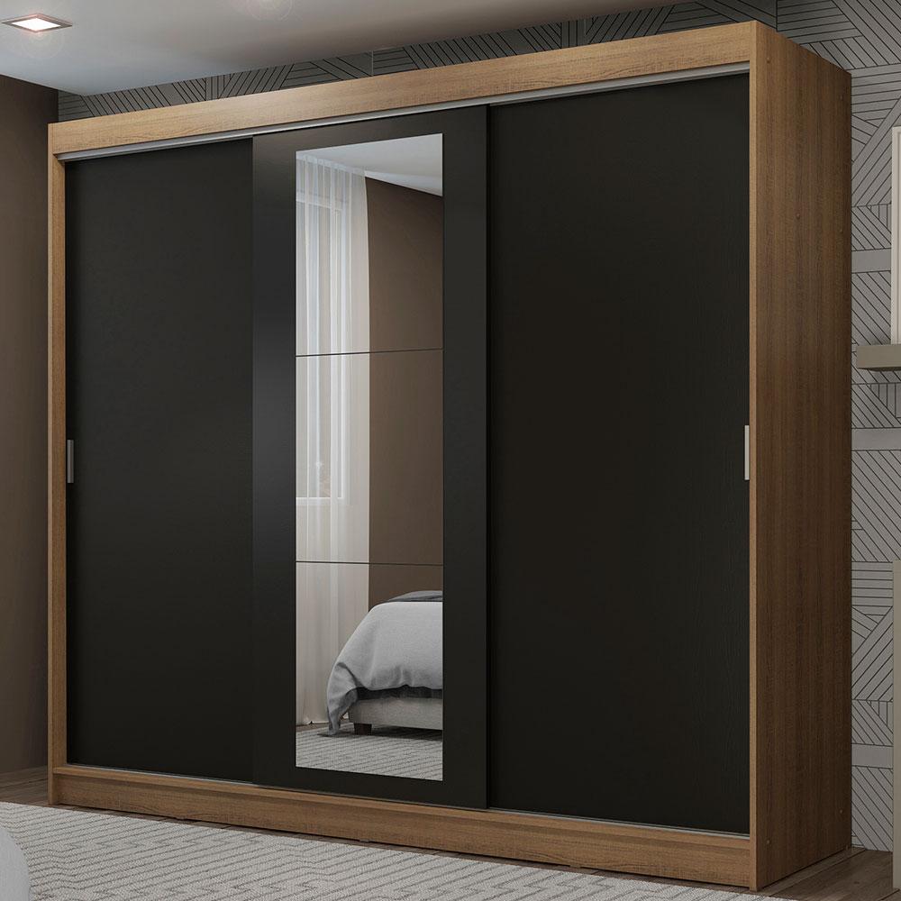 O Guarda-Roupa Kansas da Madesa possui três portas de correr com deslizamento suave, trilhos em alumínio para maior resistência e dois puxadores externos. Uma das portas possui o diferencial dos espelhos, que são muito úteis no uso diário.O tamanho é pensado especialmente para a necessidade de um casal. A divisão interna é ótima, com muitas prateleiras e nichos, além de três gavetas espaçosas com corrediças metálicas, muito mais seguras e resistentes.Os dois cabideiros são em alumínio e possuem espaços tanto para roupas curtas quanto mais longas. Ou seja, tem lugar pra organizar tudo: roupas, calçados, malas, travesseiros, edredons e muito mais.O acabamento externo é no padrão amadeirado Rustic, as portas são pretas e a parte interna é branca. É feito com a Pintura Poliéster de 7 camadas exclusiva da Madesa, um método ecologicamente correto e que traz mais proteção ao móvel.Medidas totais do móvel: 218 cm de altura x 215 cm de largura x 54 cm de profundidade.As imagens são meramente ilustrativas.Itens inclusos:- Três (3) portas de correr com sistema anti-descarrilhamento, sendo uma delas com espelhos- Dois (2) puxadores em PVC- Três (3) gavetas internas com corrediças metálicas- Dois (2) cabideiros em alumínioCódigo do produto: 10187K1EObs.: A Madesa não disponibiliza serviço de montagem. A embalagem acompanha as ferragens necessárias e o manual com todos os passos para a instalação do produto.1 – O produto é novo ou usado?R.: Todos os produtos da Madesa são novos, enviados da nossa fábrica diretamente para as casas de nossos clientes.2 – O produto vem montado? Se não, vocês realizam a montagem?R.: A Madesa não disponibiliza serviço de montagem. Todos os produtos seguem com manual de instalação e as ferragens necessárias. Alguns produtos possuem vídeo explicando o passo a passo da montagem.3 – Vocês possuem loja física? Posso retirar meu produto em mãos?R.: Não possuímos loja física, apenas loja virtual. Confira as opções de envio ao colocar o seu CEP.4 – Qual é o valor do envio? Posso pagar separadamente?R.: O valor do envio é calculado com base no peso e volume do produto, e no CEP de destino. Você pode calcular o valor e prazo de entrega no simulador.5 – A Madesa entrega em todo Brasil? Como é feita a entrega?R.: Sim, entregamos no Brasil inteiro através de transportadoras parceiras.6 – O produto acompanha Nota Fiscal?R.: Sim, todos os produtos são entregues com suas respectivas notas fiscais.7 – Os produtos possuem garantia?R.: Sim. A Madesa oferece 3 meses de garantia para defeitos de fabricação.A Madesa se dedica à sustentabilidade com várias iniciativas: temos uma usina própria para gerar energia que abastece uma de nossas fábricas. Selecionamos nossos fornecedores, priorizando aqueles que possuem um compromisso com a sustentabilidade e proteção do meio ambiente. Todo o plástico utilizado no setor produtivo é proveniente de reciclagem e as suas sobras são encaminhadas ao fornecedor que os recicla. Também investimos no desenvolvimento contínuo de nossos colaboradores e em ações educacionais que beneficiem a comunidade.