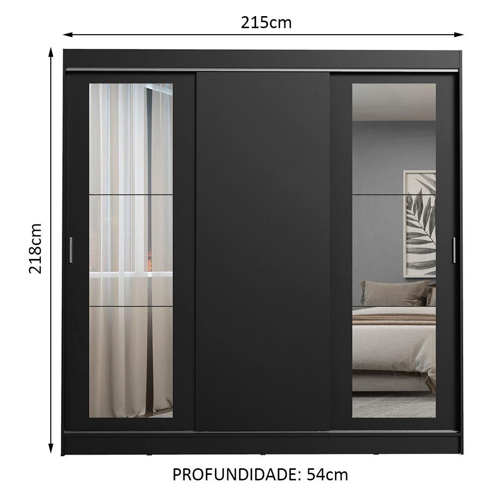 O Guarda-Roupa Kansas da Madesa possui três portas de correr com deslizamento suave, trilhos em alumínio para maior resistência e dois puxadores externos. Duas das portas contam com o diferencial dos espelhos, que são bastante práticos.O tamanho é pensado especialmente para a necessidade de um casal. A divisão interna é ótima, com muitas prateleiras e nichos, além de três gavetas espaçosas com corrediças metálicas, muito mais seguras e resistentes.Os dois cabideiros são em alumínio e possuem espaços tanto para roupas curtas quanto mais longas. Ou seja, tem lugar pra organizar tudo: roupas, calçados, malas, travesseiros, edredons e muito mais.O acabamento externo é preto e a parte interna é branca. O método utilizado é a Pintura Poliéster exclusiva da Madesa, um processo ecologicamente correto e que conserva o móvel por muito mais tempo.Medidas totais do móvel: 218 cm de altura x 215 cm de largura x 54 cm de profundidade.As imagens são meramente ilustrativas.Itens inclusos:- Três (3) portas de correr com sistema anti-descarrilhamento, sendo duas delas com espelhos- Dois (2) puxadores em PVC- Três (3) gavetas internas com corrediças metálicas- Dois (2) cabideiros em alumínioCódigo do produto: 10188N2EObs.: A Madesa não disponibiliza serviço de montagem. A embalagem acompanha as ferragens necessárias e o manual com todos os passos para a instalação do produto.1 – O produto é novo ou usado?R.: Todos os produtos da Madesa são novos, enviados da nossa fábrica diretamente para as casas de nossos clientes.2 – O produto vem montado? Se não, vocês realizam a montagem?R.: A Madesa não disponibiliza serviço de montagem. Todos os produtos seguem com manual de instalação e as ferragens necessárias. Alguns produtos possuem vídeo explicando o passo a passo da montagem.3 – Vocês possuem loja física? Posso retirar meu produto em mãos?R.: Não possuímos loja física, apenas loja virtual. Confira as opções de envio ao colocar o seu CEP.4 – Qual é o valor do envio? Posso pagar separadamente?R.: O valor do envio é calculado com base no peso e volume do produto, e no CEP de destino. Você pode calcular o valor e prazo de entrega no simulador.5 – A Madesa entrega em todo Brasil? Como é feita a entrega?R.: Sim, entregamos no Brasil inteiro através de transportadoras parceiras.6 – O produto acompanha Nota Fiscal?R.: Sim, todos os produtos são entregues com suas respectivas notas fiscais.7 – Os produtos possuem garantia?R.: Sim. A Madesa oferece 3 meses de garantia para defeitos de fabricação.A Madesa se dedica à sustentabilidade com várias iniciativas: temos uma usina própria para gerar energia que abastece uma de nossas fábricas. Selecionamos nossos fornecedores, priorizando aqueles que possuem um compromisso com a sustentabilidade e proteção do meio ambiente. Todo o plástico utilizado no setor produtivo é proveniente de reciclagem e as suas sobras são encaminhadas ao fornecedor que os recicla. Também investimos no desenvolvimento contínuo de nossos colaboradores e em ações educacionais que beneficiem a comunidade.