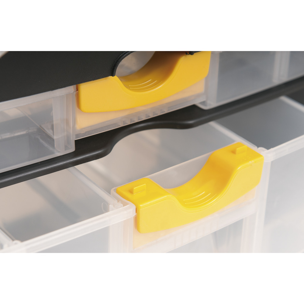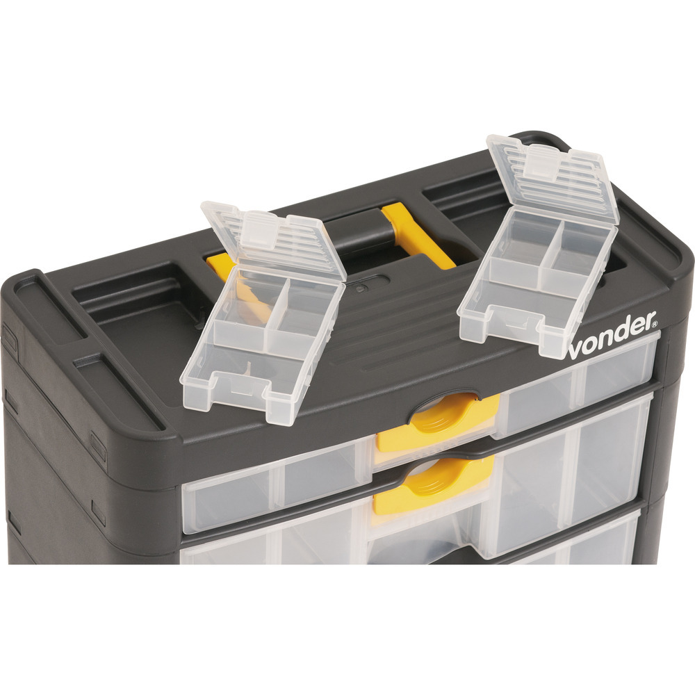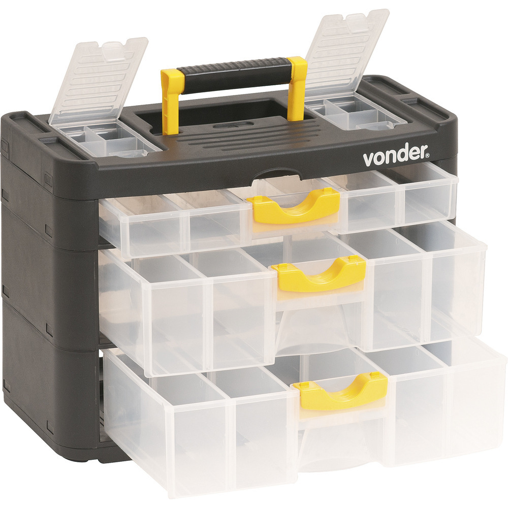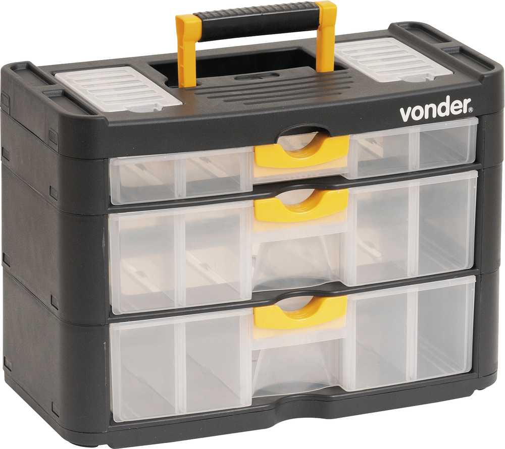 Conteúdo da embalagem1 Organizador plásticoAplicações e dicas de usoIndicado para organizar e armazenar peças e acessórios em geralDestaques e diferenciaisPossui alça para transporte, 3 gavetas e 2 compartimentos externos DETALHES TÉCNICOS Comprimento do organizador para ferramentas: 400,0 mm Largura do organizador para ferramentas: 200,0 mm Altura do organizador para ferramentas: 285,0 mm Material do organizador para ferramentas: Polipropileno Cor do organizador para ferramentas: Preto e transparente Capacidade de carga: 9 kg