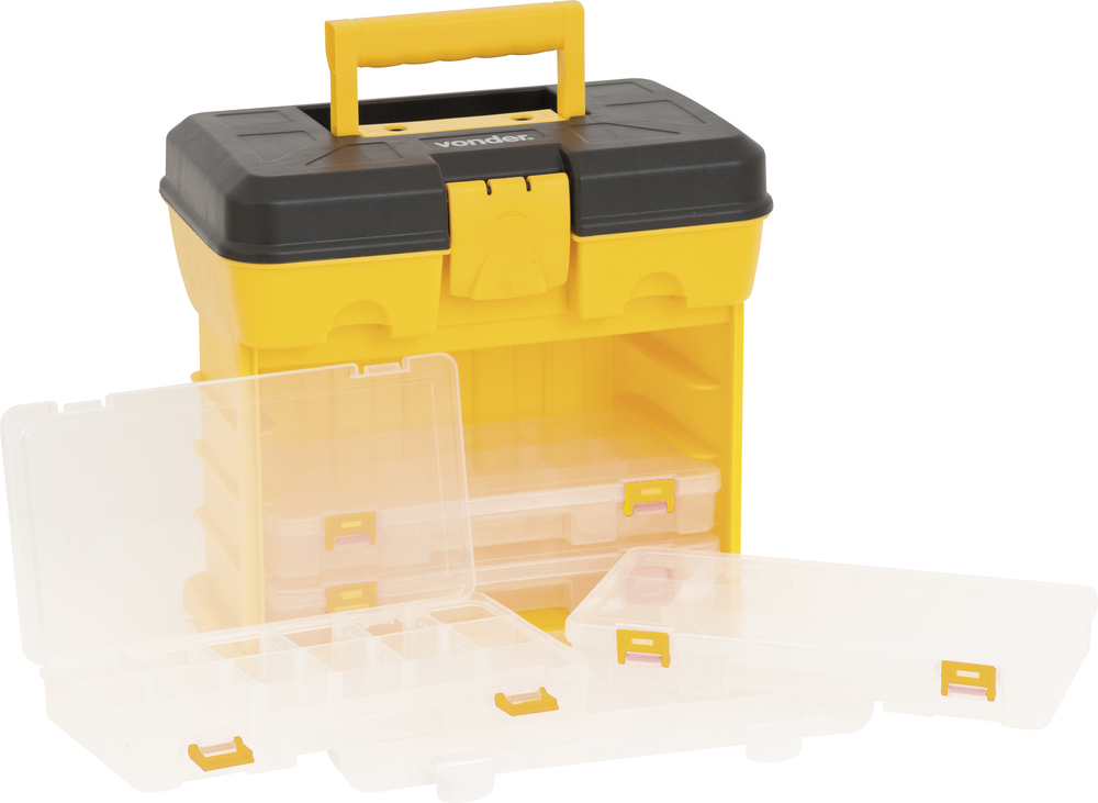 Conteúdo da embalagem1 Organizador plásticoAplicações e dicas de usoIndicado para organizar e armazenar peças e acessórios em geralDestaques e diferenciaisPossui alça para transporte, 4 bandejas móveis e 1 compartimento na tampa DETALHES TÉCNICOS Comprimento do organizador para ferramentas: 275,0 mm Largura do organizador para ferramentas: 175,0 mm Altura do organizador para ferramentas: 260,0 mm Material do organizador para ferramentas: Polipropileno Cor do organizador para ferramentas: Preto/amarelo e transparentes Capacidade de carga: 10 kg