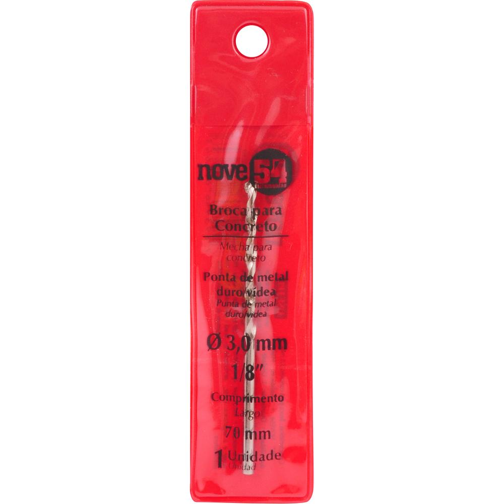 Ref.: do Fornecedor:5351000030Marca:Nove54Conteúdo da Embalagem:1 Broca para concretoDestaques e diferenciais:Possui ponta de metal duro/vídea, proporcionando maior durabilidade. Conta com acabamento niquelado, que assegura maior resistência contra oxidação/corrosão.Aplicações e dicas de uso:Indicada para uso em concreto, alvenaria, entre outros.Características Técnicas:Diâmetro da broca (mm): 3,00 mm Diâmetro da broca (pol): 0.1/8 " Comprimento total da broca (mm): 70,0 mm Diâmetro da haste reduzida: N/A Série da broca: Normal
