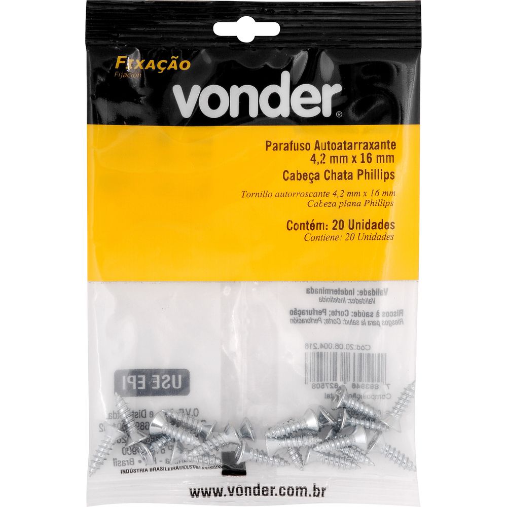 Marca: VonderConteúdo da Embalagem:1 Cartela com 20 parafusosDestaques e diferenciais:Possui acabamento zincado que aumenta a resistência contra corrosão/oxidação. Conta com cabeça chata/cônica que oferece acabamento rente à superfície.Aplicações e dicas de uso:Indicado para fixações de acessórios e objetos em paredes de alvenaria e concreto com buchas de fixação. Permite fixações em móveis tubulares, equipamentos fabricados com chapas metálicas finas e esquadrias de alumínio. Muito utilizado na fabricação de móveis em madeira e MDF.Características Técnicas:Material do parafuso autoatarraxante: Aço carbono Acabamento do parafuso autoatarraxante: Zincado Diâmetro da rosca do parafuso autoatarraxante: 4,2 mm Comprimento do parafuso autoatarraxante: 16,0 mm Tipo da cabeça do parafuso autoatarraxante: Chata Tipo da fenda do parafuso autoatarraxante: Phillips (fenda cruzada)