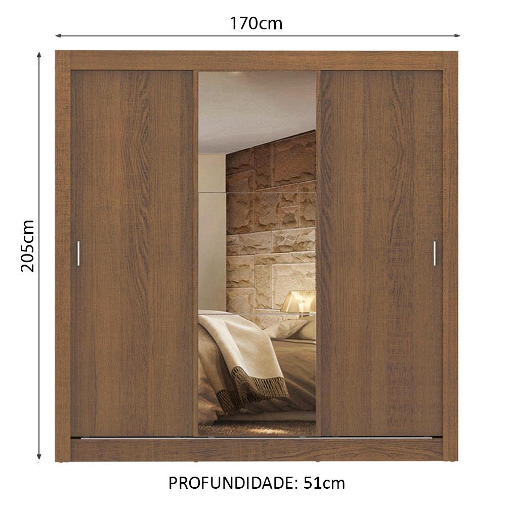O Guarda-Roupa de Casal com melhor custo benefício do mercado. Ferragens de qualidade, uma porta com espelho, cabideiro metálico e pintura em Poliéster Protetor que confere durabilidade e resistência. As portas de correr possuem trilho superior e inferior em alumínio e sistema de deslizamento suave garantindo melhor funcionamento.Total aproveitamento interno levando em conta o uso de duas pessoas. São duas gavetas internas na tonalidade branca com corrediça metálica, muitos nichos que facilitam a organização de roupas, calçados e acessórios. O tubo cabideiro é muito resistente e possui espaço para roupas longas.O acabamento externo é no padrão amadeirado Rustic e o interno é branco. Feito em Pintura Poliéster de alta resistência que confere maior durabilidade ao produto. A pintura é ecológica, isenta de gases que vão para a atmosfera.Medidas totais do armário: 205 cm de altura x 170 cm de largura x 51 cm de profundidade.Imagem meramente ilustrativa.Itens inclusos:- Três (3) prateleiras totalizando cinco (5) nichos- Duas (2) gavetas internas brancas- Um (1) cabideiro grande- Três (3) portas de correr sendo duas (2) de madeira com dois (2) puxadores em alumínio e uma (1) com espelhoObs.: A Madesa não disponibiliza serviço de montagem. O produto segue com manual de instalação e todas as ferragens necessárias para sua montagem.1-O produto é novo ou usado?R.: Todos os produtos da Madesa são novos, enviados da nossa fábrica diretamente para as casas de nossos clientes.2-O produto vem montado? Se não, vocês realizam a montagem?R.: A Madesa não disponibiliza serviço de montagem. Todos os produtos seguem com manual de instalação e as ferragens necessárias. Alguns produtos possuem vídeo explicando o passo a passo da montagem.3-Vocês possuem loja física? Posso retirar meu produto em mãos?R.: Não possuímos loja física, apenas loja virtual. Confira as opções de envio ao colocar o seu CEP.4-Qual é o valor do envio? Posso pagar separadamente?R.: O valor do envio é calculado com base no peso e volume do produto, e no CEP de destino. Você pode calcular o valor e prazo de entrega no simulador.5-A Madesa entrega em todo Brasil? Como é feita a entrega?R.: Sim, entregamos no Brasil inteiro através de transportadoras parceiras.6-O produto acompanha Nota Fiscal?R.: Sim, todos os produtos são entregues com suas respectivas notas fiscais.7-Os produtos possuem garantia?R.: Sim. A Madesa oferece 3 meses de garantia para defeitos de fabricação.A Madesa se dedica à sustentabilidade com várias iniciativas: temos uma usina própria para gerar energia que abastece uma de nossas fábricas. Selecionamos nossos fornecedores, priorizando aqueles que possuem um compromisso com a sustentabilidade e proteção do meio ambiente. Todo o plástico utilizado no setor produtivo é proveniente de reciclagem e as suas sobras são encaminhadas ao fornecedor que os recicla. Também investimos no desenvolvimento contínuo de nossos colaboradores e em ações educacionais que beneficiem a comunidade.