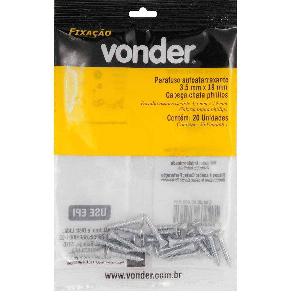 Marca: VonderConteúdo da Embalagem:1 Cartela com 20 parafusosDestaques e diferenciais:Possui acabamento zincado que aumenta a resistência contra corrosão/oxidação. Conta com cabeça chata/cônica que oferece acabamento rente à superfície.Aplicações e dicas de uso:Indicado para fixações de acessórios e objetos em paredes de alvenaria e concreto com buchas de fixação. Permite fixações em móveis tubulares, equipamentos fabricados com chapas metálicas finas e esquadrias de alumínio. Muito utilizado na fabricação de móveis em madeira e MDF.Características Técnicas:Material do parafuso autoatarraxante: Aço carbono Acabamento do parafuso autoatarraxante: Zincado Diâmetro da rosca do parafuso autoatarraxante: 3,5 mm Comprimento do parafuso autoatarraxante: 19,0 mm Tipo da cabeça do parafuso autoatarraxante: Chata Tipo da fenda do parafuso autoatarraxante: Phillips (fenda cruzada)