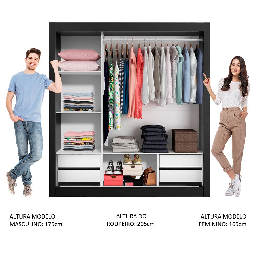 Guarda-Roupa de Casal com ferragens de qualidade, cabideiro metálico e pintura em Poliéster Protetor que confere durabilidade e resistência. As portas de correr possuem trilho superior e inferior em alumínio e sistema de deslizamento suave garantindo melhor funcionamento.Possui total aproveitamento interno levando em conta o uso de duas pessoas. São quatro gavetas internas com corrediça metálica, diversos nichos que facilitam a organização de roupas, calçados e acessórios. O tubo cabideiro é muito resistente e possui espaço para roupas longas.O acabamento combina os tons branco e preto e o processo de pintura é ecológico, isento de gases que prejudicam a atmosfera.Medidas totais do armário: 205 cm de altura x 170 cm de largura x 51 cm de profundidade.Imagens meramente ilustrativas.Itens inclusos:- Três (3) prateleiras totalizando quatro (4) nichos- Quatro (4) gavetas internas brancas- Um (1) cabideiro grande- Três (3) portas de correr e dois (2) puxadores em alumínioCódigo do produto: 1093774GObs.: A Madesa não disponibiliza serviço de montagem. O produto segue com manual de instalação e todas as ferragens necessárias para sua montagem.1 – O produto é novo ou usado?R.: Todos os produtos da Madesa são novos, enviados da nossa fábrica diretamente para as casas de nossos clientes.2 – O produto vem montado? Se não, vocês realizam a montagem?R.: A Madesa não disponibiliza serviço de montagem. Todos os produtos seguem com manual de instalação e as ferragens necessárias. Alguns produtos possuem vídeo explicando o passo a passo da montagem.3 – Vocês possuem loja física? Posso retirar meu produto em mãos?R.: Não possuímos loja física, apenas loja virtual. Confira as opções de envio ao colocar o seu CEP.4 – Qual é o valor do envio? Posso pagar separadamente?R.: O valor do envio é calculado com base no peso e volume do produto, e no CEP de destino. Você pode calcular o valor e prazo de entrega no simulador.5 – A Madesa entrega em todo Brasil? Como é feita a entrega?R.: Sim, entregamos no Brasil inteiro através de transportadoras parceiras.6 – O produto acompanha Nota Fiscal?R.: Sim, todos os produtos são entregues com suas respectivas notas fiscais.7 – Os produtos possuem garantia?R.: Sim. A Madesa oferece 3 meses de garantia para defeitos de fabricação.A Madesa se dedica à sustentabilidade com várias iniciativas: temos uma usina própria para gerar energia que abastece uma de nossas fábricas. Selecionamos nossos fornecedores, priorizando aqueles que possuem um compromisso com a sustentabilidade e proteção do meio ambiente. Todo o plástico utilizado no setor produtivo é proveniente de reciclagem e as suas sobras são encaminhadas ao fornecedor que os recicla. Também investimos no desenvolvimento contínuo de nossos colaboradores e em ações educacionais que beneficiem a comunidade.