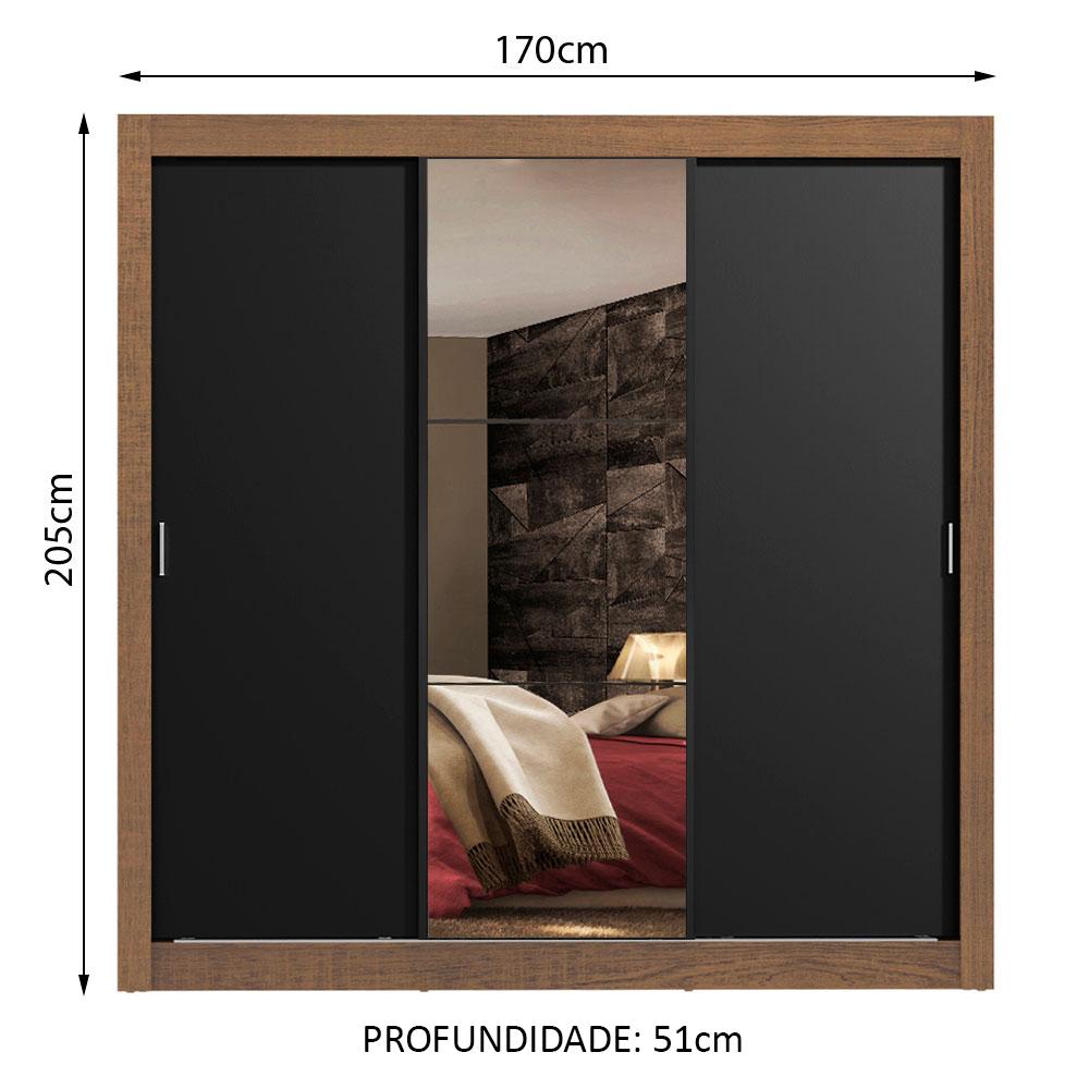Guarda-Roupa de Casal com ferragens de qualidade, cabideiro metálico e pintura em Poliéster Protetor que confere durabilidade e resistência. As portas de correr possuem trilho superior e inferior em alumínio e sistema de deslizamento suave garantindo melhor funcionamento.Total aproveitamento interno levando em conta o uso de duas pessoas. São quatro gavetas internas com corrediça metálica, diversos nichos que facilitam a organização de roupas, calçados e acessórios. O tubo cabideiro é muito resistente e possui espaço para roupas longas.O acabamento da estrutura e da parte interna combina os tons branco e amadeirado Rustic. As portas são pretas. O processo de pintura é ecológico, isento de gases que prejudicam a atmosfera.Medidas totais do armário: 205 cm de altura x 170 cm de largura x 51 cm de profundidade.Imagens meramente ilustrativas.Itens inclusos:- Três (3) prateleiras totalizando quatro (4) nichos- Quatro (4) gavetas internas brancas- Um (1) cabideiro grande- Três (3) portas de correr sendo uma (1) com espelhos e duas (2) de madeira e puxadores em alumínioCódigo do produto: 10937K1E4GObs.: A Madesa não disponibiliza serviço de montagem. O produto segue com manual de instalação e todas as ferragens necessárias para sua montagem.1 – O produto é novo ou usado?R.: Todos os produtos da Madesa são novos, enviados da nossa fábrica diretamente para as casas de nossos clientes.2 – O produto vem montado? Se não, vocês realizam a montagem?R.: A Madesa não disponibiliza serviço de montagem. Todos os produtos seguem com manual de instalação e as ferragens necessárias. Alguns produtos possuem vídeo explicando o passo a passo da montagem.3 – Vocês possuem loja física? Posso retirar meu produto em mãos?R.: Não possuímos loja física, apenas loja virtual. Confira as opções de envio ao colocar o seu CEP.4 – Qual é o valor do envio? Posso pagar separadamente?R.: O valor do envio é calculado com base no peso e volume do produto, e no CEP de destino. Você pode calcular o valor e prazo de entrega no simulador.5 – A Madesa entrega em todo Brasil? Como é feita a entrega?R.: Sim, entregamos no Brasil inteiro através de transportadoras parceiras.6 – O produto acompanha Nota Fiscal?R.: Sim, todos os produtos são entregues com suas respectivas notas fiscais.7 – Os produtos possuem garantia?R.: Sim. A Madesa oferece 3 meses de garantia para defeitos de fabricação.A Madesa se dedica à sustentabilidade com várias iniciativas: temos uma usina própria para gerar energia que abastece uma de nossas fábricas. Selecionamos nossos fornecedores, priorizando aqueles que possuem um compromisso com a sustentabilidade e proteção do meio ambiente. Todo o plástico utilizado no setor produtivo é proveniente de reciclagem e as suas sobras são encaminhadas ao fornecedor que os recicla. Também investimos no desenvolvimento contínuo de nossos colaboradores e em ações educacionais que beneficiem a comunidade.