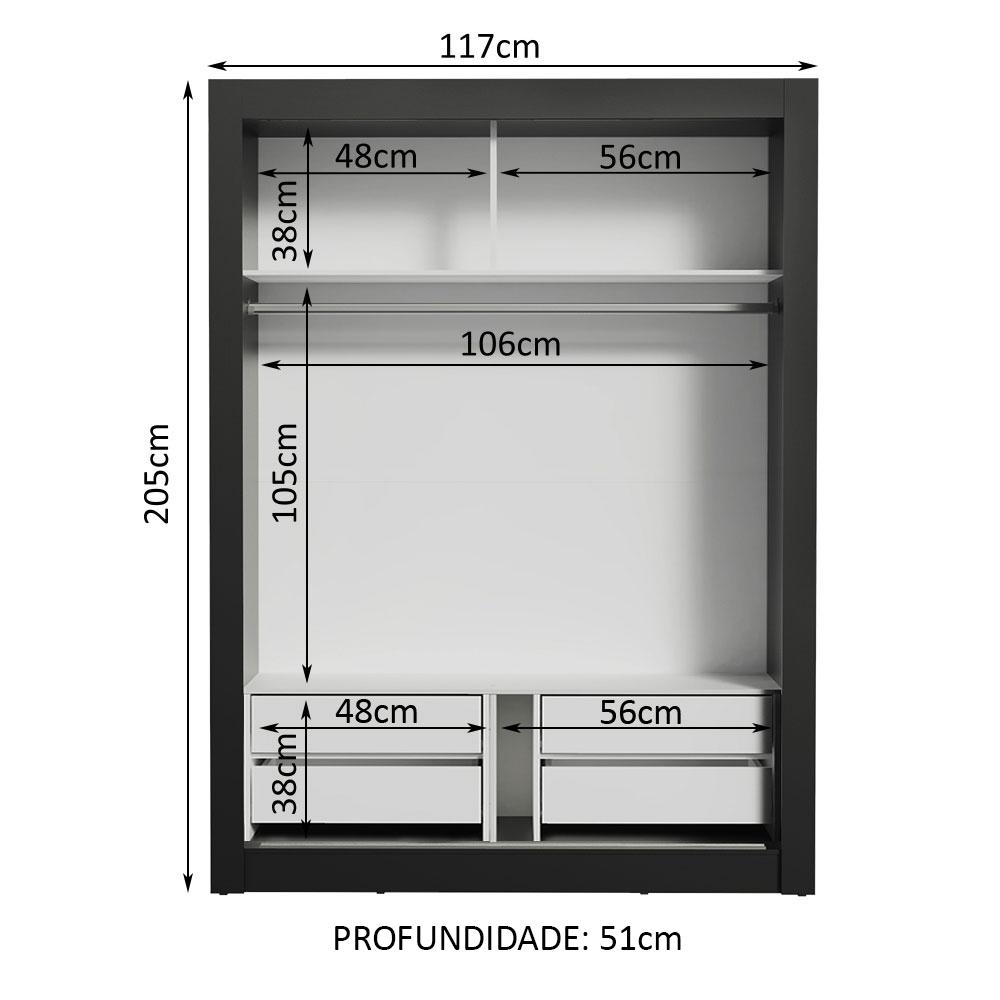 Guarda-Roupa com duas portas de correr de deslizamento suave, trilhos em alumínio, dobradiças metálicas e ferragens de qualidade que proporcionam melhor sustentação ao móvel. Contempla duas prateleiras e dois nichos, além de um cabideiro de metal resistente e de tamanho diferenciado, 105 cm, com espaço para roupas longas.Um dos grandes diferenciais deste modelo são as quatro gavetas, que possuem corrediças metálicas e proporcionam uma ótima organização de roupas, acessórios e o que mais você preferir. Para completar, as duas portas possuem espelhos, que são muito práticos no dia a dia e ampliam e valorizam o ambiente.Com tamanho ideal para quarto de solteiro, possui acabamento interno branco. A parte externa e as portas são pretas. O processo é feito coma Pintura Poliéster de 7 camadas exclusiva da Madesa. Este processo é ecológico e aumenta a durabilidade ao móvel.Medidas totais do guarda-roupa: 205 cm de altura x 117 cm de largura x 51 cm de profundidade.As imagens são meramente ilustrativas.Itens inclusos:- Um (1) cabideiro metálico grande- Duas (2) prateleiras e dois (2) nichos- Quatro (4) gavetas com corrediças metálicas- Duas (2) portas de correr com espelhos e puxadores em PVCCódigo do produto: 10948N2E4GObs.: A Madesa não oferece serviço de montagem. A embalagem acompanha ferragens e manual com todos os passos para a montagem do produto.1 – O produto é novo ou usado?R.: Todos os produtos da Madesa são novos, enviados da nossa fábrica diretamente para as casas de nossos clientes.2 – O produto vem montado? Se não, vocês realizam a montagem?R.: A Madesa não disponibiliza serviço de montagem. Todos os produtos seguem com manual de instalação e as ferragens necessárias. Alguns produtos possuem vídeo explicando o passo a passo da montagem.3 – Vocês possuem loja física? Posso retirar meu produto em mãos?R.: Não possuímos loja física, apenas loja virtual. Confira as opções de envio ao colocar o seu CEP.4 – Qual é o valor do envio? Posso pagar separadamente?R.: O valor do envio é calculado com base no peso e volume do produto, e no CEP de destino. Você pode calcular o valor e prazo de entrega no simulador.5 – A Madesa entrega em todo Brasil? Como é feita a entrega?R.: Sim, entregamos no Brasil inteiro através de transportadoras parceiras.6 – O produto acompanha Nota Fiscal?R.: Sim, todos os produtos são entregues com suas respectivas notas fiscais.7 – Os produtos possuem garantia?R.: Sim. A Madesa oferece 3 meses de garantia para defeitos de fabricação.A Madesa se dedica à sustentabilidade com várias iniciativas: temos uma usina própria para gerar energia que abastece uma de nossas fábricas. Selecionamos nossos fornecedores, priorizando aqueles que possuem um compromisso com a sustentabilidade e proteção do meio ambiente. Todo o plástico utilizado no setor produtivo é proveniente de reciclagem e as suas sobras são encaminhadas ao fornecedor que os recicla. Também investimos no desenvolvimento contínuo de nossos colaboradores e em ações educacionais que beneficiem a comunidade.
