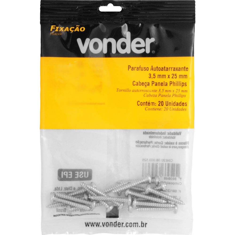 Marca: VonderConteúdo da Embalagem:1 Cartela com 20 parafusosDestaques e diferenciais:Possui acabamento zincado que aumenta a resistência contra corrosão/oxidação, além de cabeça tipo phillips, que proporciona maior força de aperto e menor possibilidade da chave ou bits escapar e riscar a peça que está sendo trabalhada.Aplicações e dicas de uso:Indicado para fixações de acessórios e objetos em paredes de alvenaria e concreto com buchas de fixação. Permite fixações em móveis tubulares, equipamentos fabricados com chapas metálicas finas e esquadrias de alumínio. Muito utilizado na fabricação de móveis em madeira e MDF.Características Técnicas:Material do parafuso autoatarraxante: Aço carbono Acabamento do parafuso autoatarraxante: Zincado Diâmetro da rosca do parafuso autoatarraxante: 3,5 mm Comprimento do parafuso autoatarraxante: 25,0 mm Tipo da cabeça do parafuso autoatarraxante: Panela Tipo da fenda do parafuso autoatarraxante: Phillips (fenda cruzada)