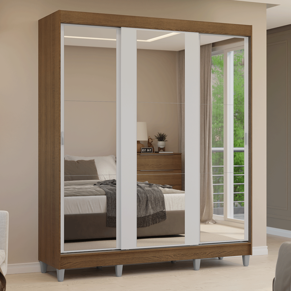 Guarda-Roupa Casal com Pés 3 Portas de Correr de Espelho Rustic/Branco Reno Madesa