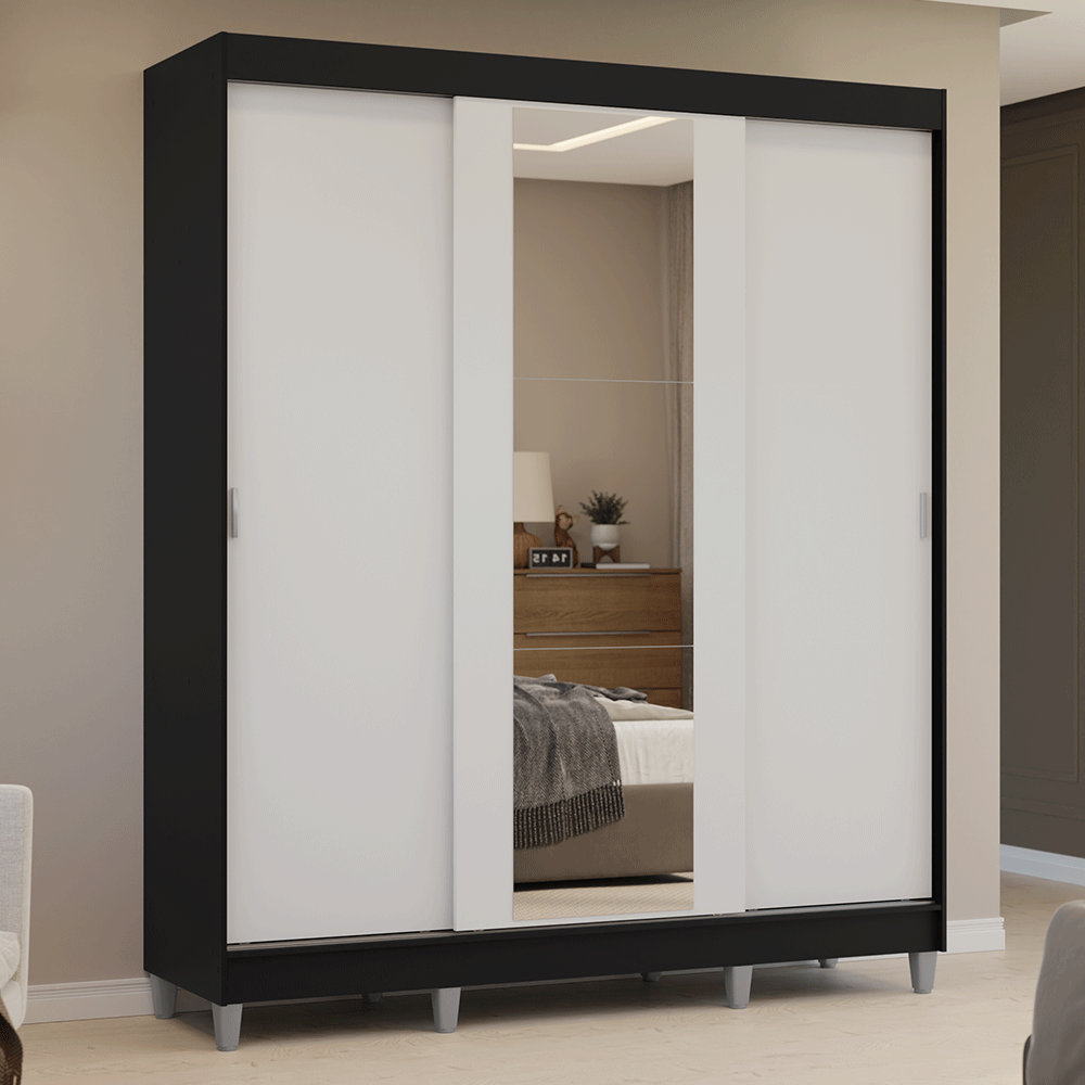 Guarda-Roupa Casal com Pés 3 Portas de Correr com Espelho Preto/Branco Reno Madesa