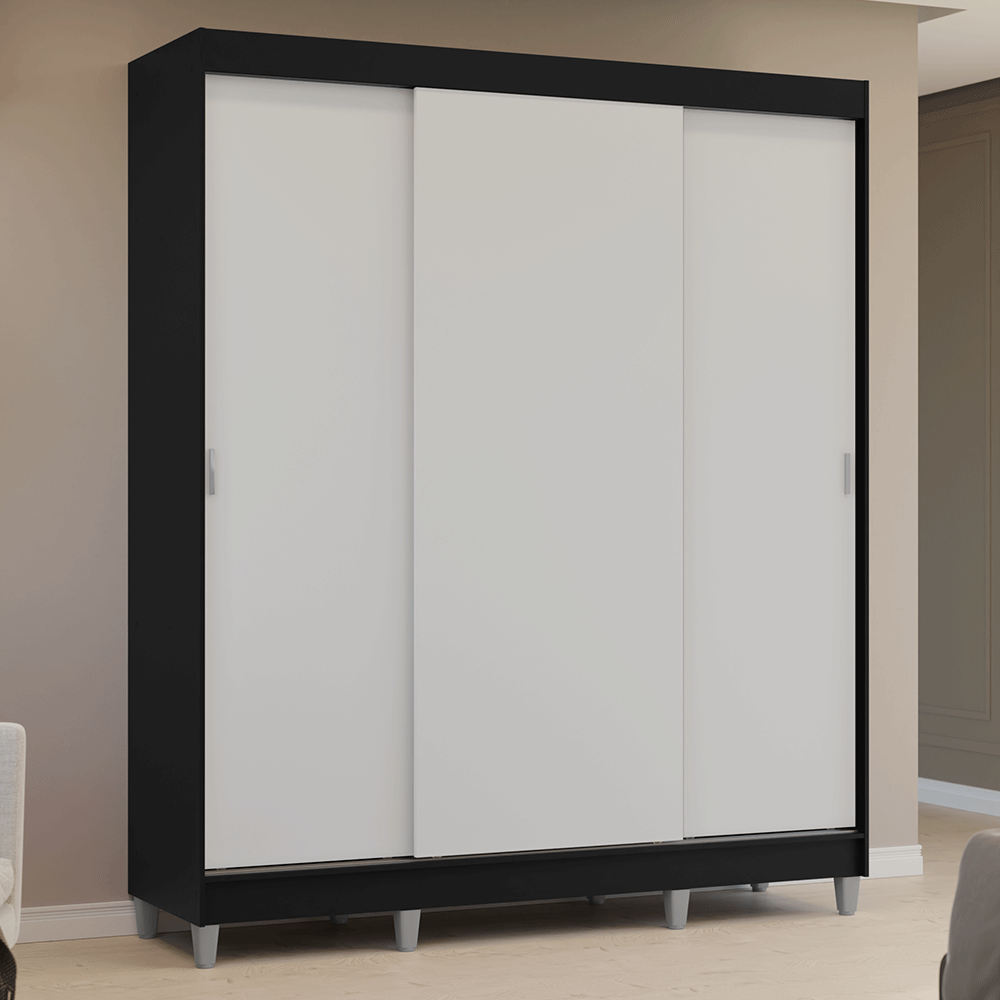 Guarda-Roupa Casal com Pés 3 Portas de Correr Preto/Branco Reno Madesa