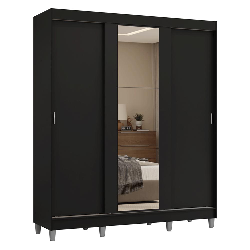 Guarda-Roupa Casal com Pés 3 Portas de Correr com Espelho Preto Reno Madesa