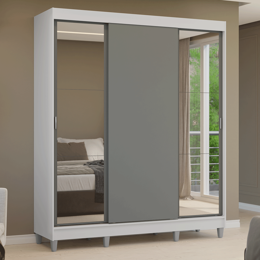 Guarda-Roupa Casal com Pés 3 Portas de Correr com Espelhos Branco/Cinza Reno Madesa