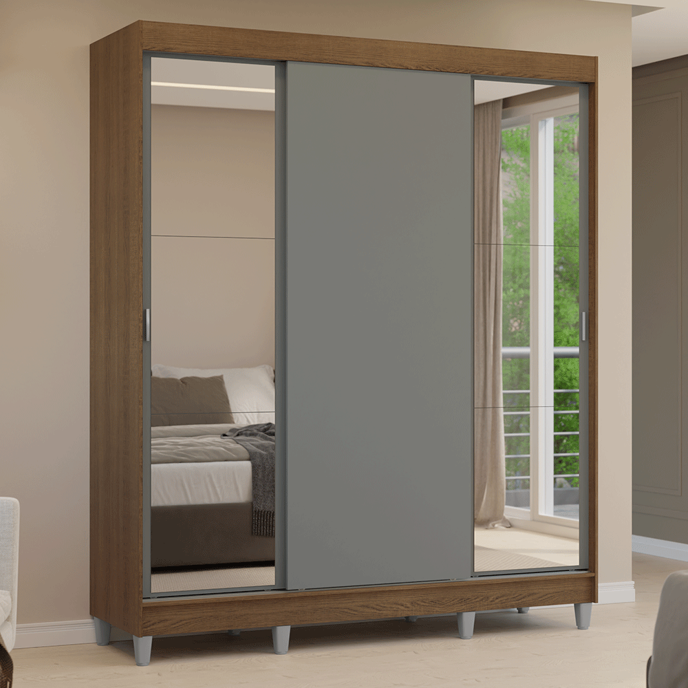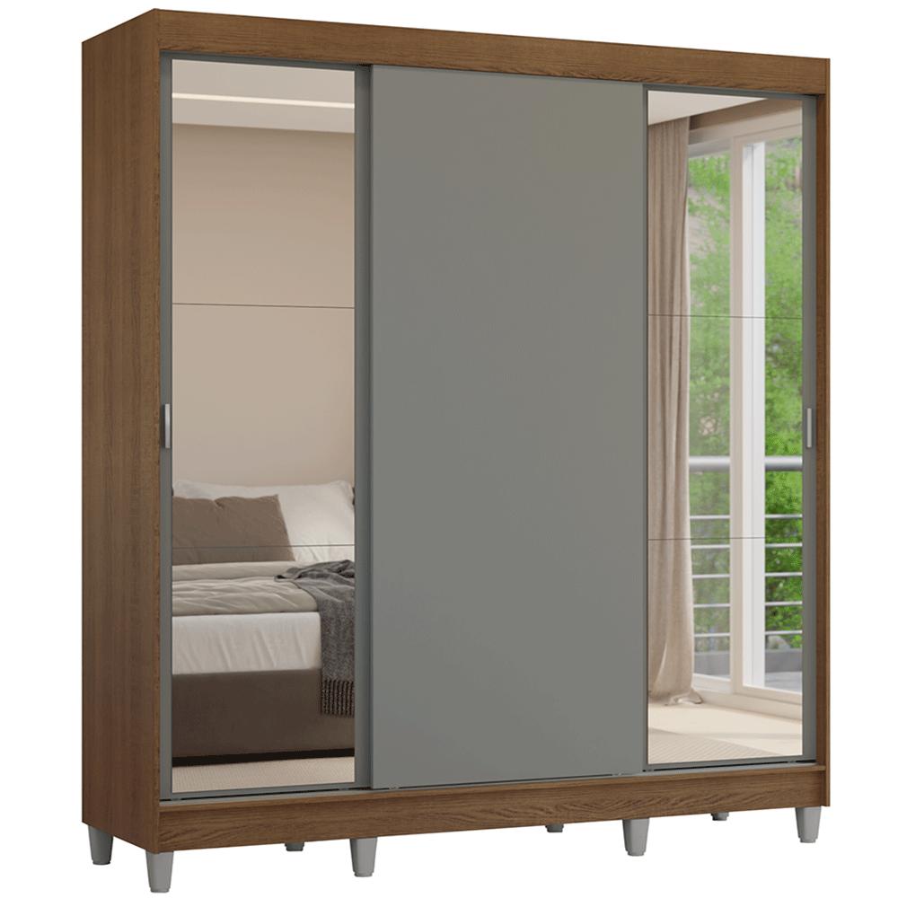 Guarda-Roupa Casal com Pés 3 Portas de Correr com Espelhos Rustic/Cinza Reno Madesa