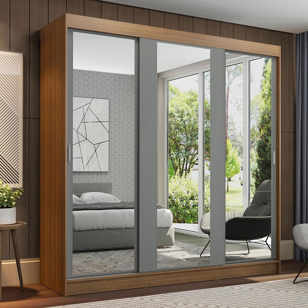 Guarda-Roupa Casal Madesa Reno 3 Portas de Correr de Espelho - Rustic/Cinza