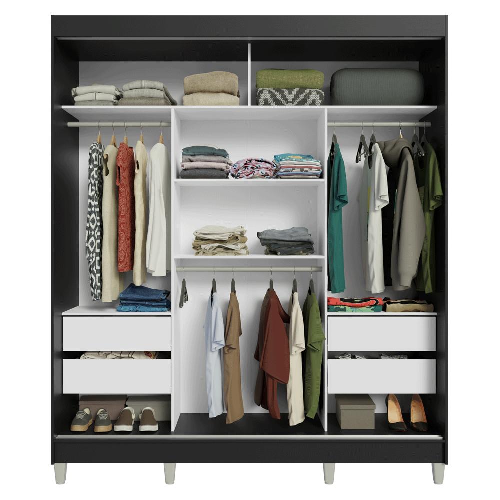 Transforme seu quarto em um espaço funcional e moderno com o Guarda-Roupa Casal Reno da Madesa.Essa versão possui três portas de correr, sendo uma com espelho, oferecendo praticidade no dia a dia e ajudando a ampliar o ambiente. Os trilhos de alumínio garantem deslizamento suave. Conta com quatro gavetas espaçosas com corrediças metálicas e três cabideiros, ideais para roupas, acessórios e outros itens, mantendo tudo organizado.O acabamento da estrutura é em preto e o das portas em cinza, combinando resistência e sofisticação. Além disso, o Guarda-Roupa Reno com pés traz um diferencial que proporciona facilidade na limpeza. Com design pensado para unir beleza e funcionalidade, ele é perfeito para transformar seu quarto em um espaço moderno e prático.Medidas:- 180 cm de largura- 54 cm de profundidade- 215 cm de alturaO que você recebe:- Um Guarda-Roupa com três portas de correr sendo uma com espelhoCódigo do produto: 1095H91ECPÉ importante saber:- Material: MDP- Imagens meramente ilustrativas.- A Madesa não disponibiliza serviço de montagem.- Por segurança, é obrigatório fixar o móvel na parede.- O produto segue com manual de instalação e todas as ferragens necessárias para sua montagem.A Madesa se dedica à sustentabilidade com várias iniciativas: temos uma usina própria que gera energia para uma das fábricas. Priorizamos fornecedores responsáveis com o meio ambiente. Todo o plástico utilizado na produção é reciclado, e as sobras também são reaproveitadas. Investimos no desenvolvimento de nossos colaboradores e em ações que beneficiem a comunidade.