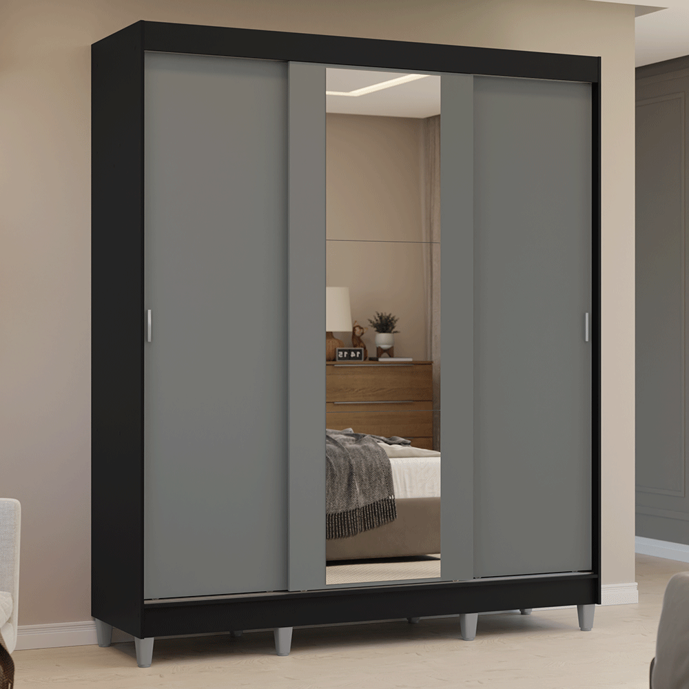 Guarda-Roupa Casal com Pés 3 Portas de Correr com Espelho Preto/Cinza Reno Madesa