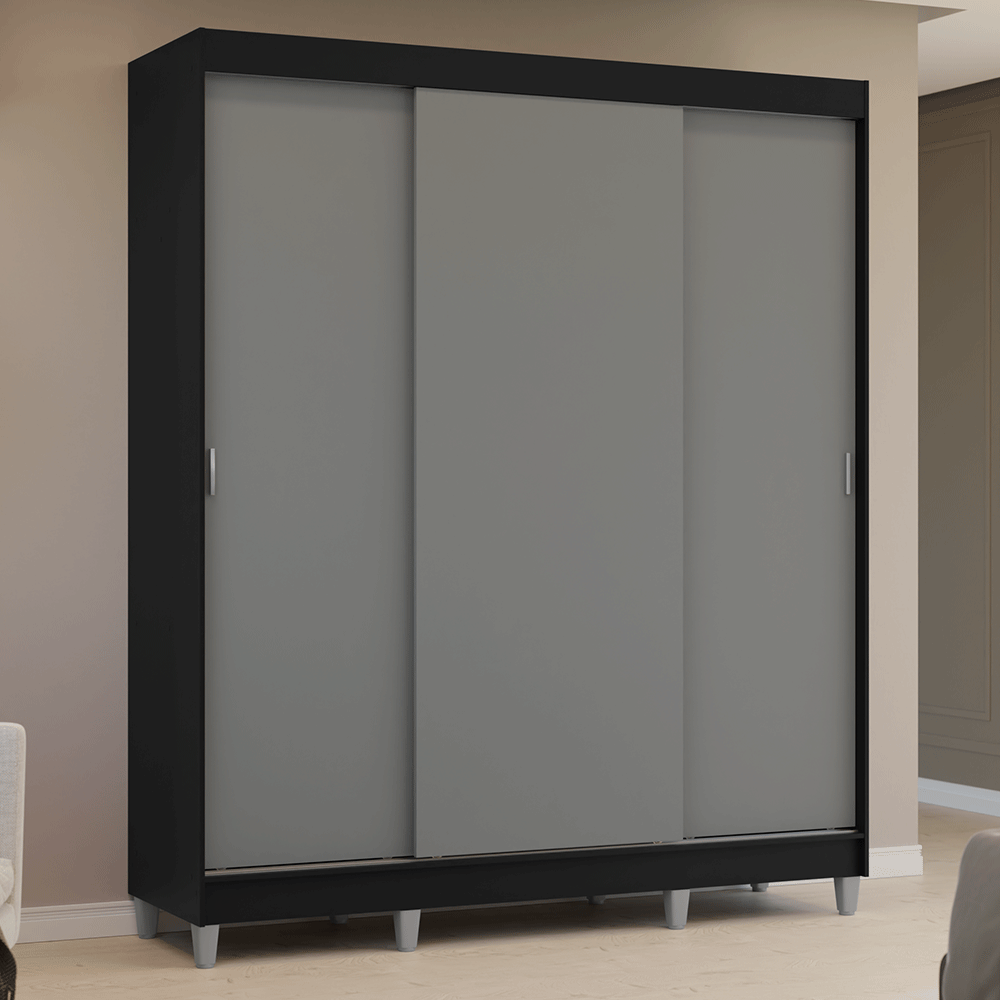 Guarda-Roupa Casal com Pés 3 Portas de Correr Preto/Cinza Reno Madesa