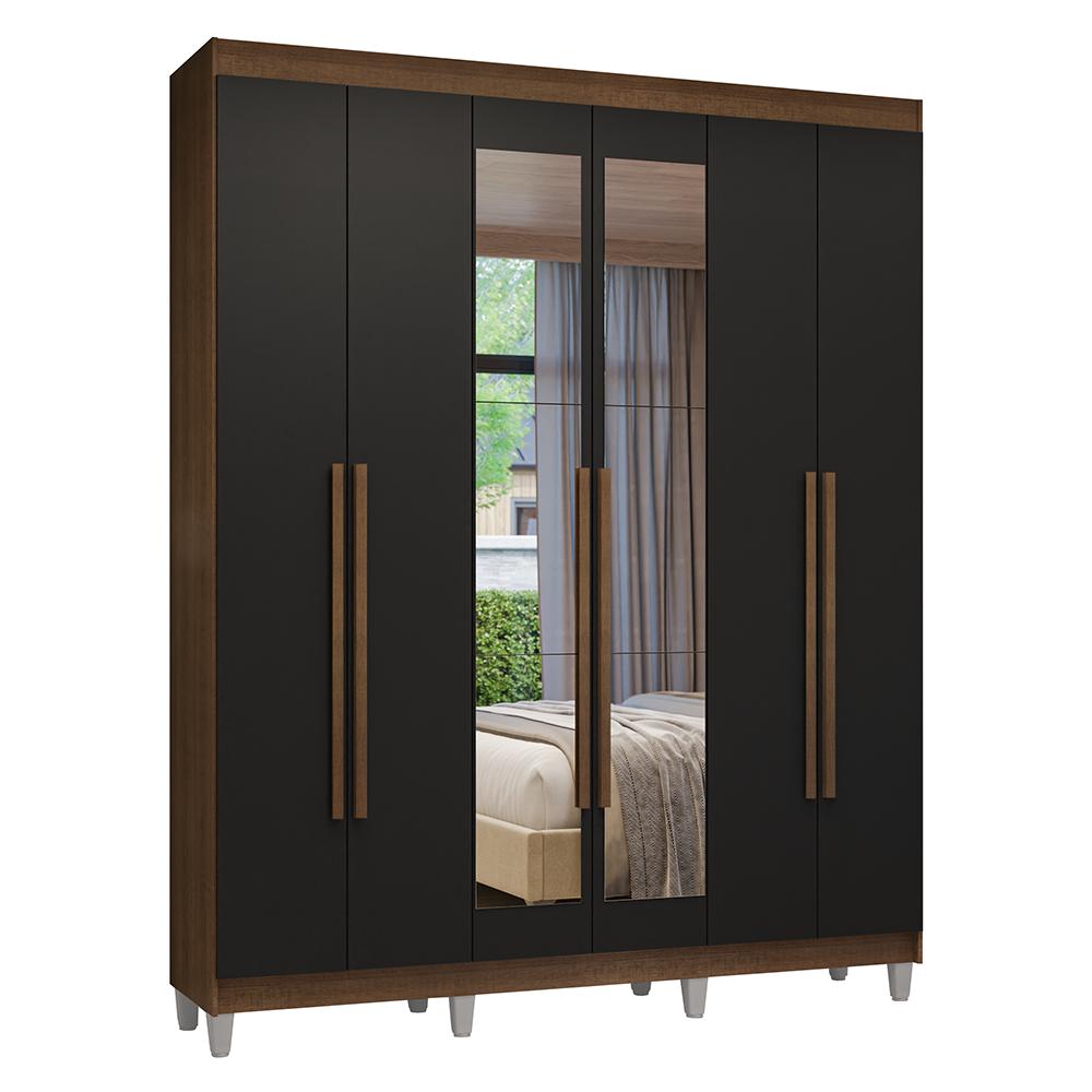 Guarda-Roupa Casal com Pés 6 Portas Batentes com Espelho Rustic/Preto/Rustic Venus Madesa