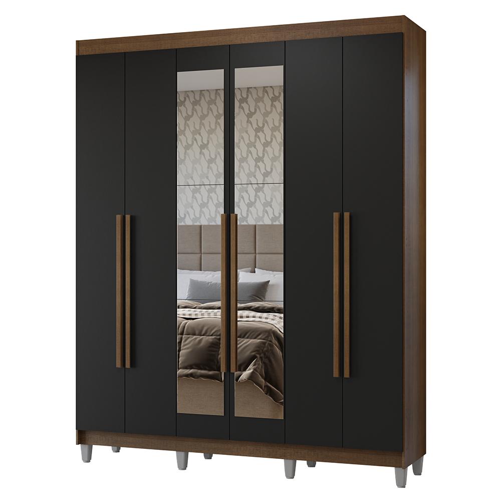 Guarda-Roupa Casal com Pés 6 Portas Batentes com Espelho Rustic/Preto/Rustic Netuno Madesa