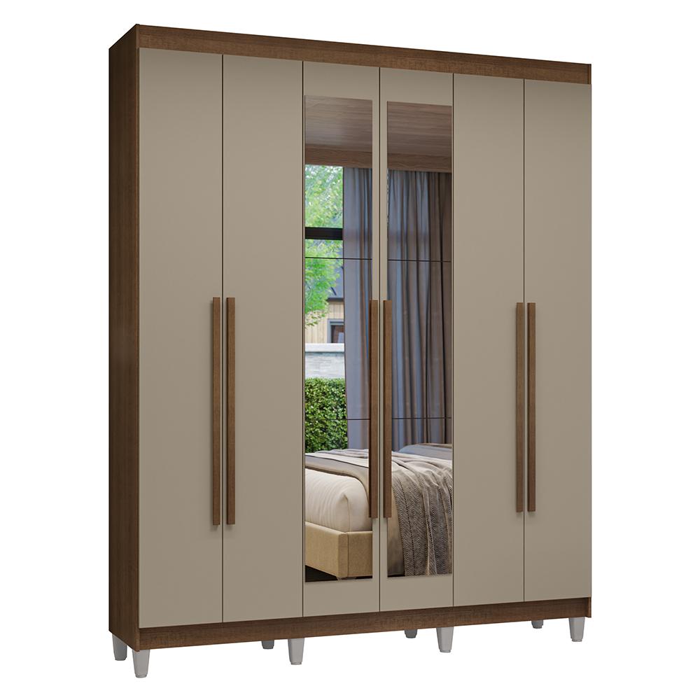 Guarda-Roupa Casal com Pés 6 Portas Batentes com Espelho Rustic/Crema/Rustic Venus Madesa
