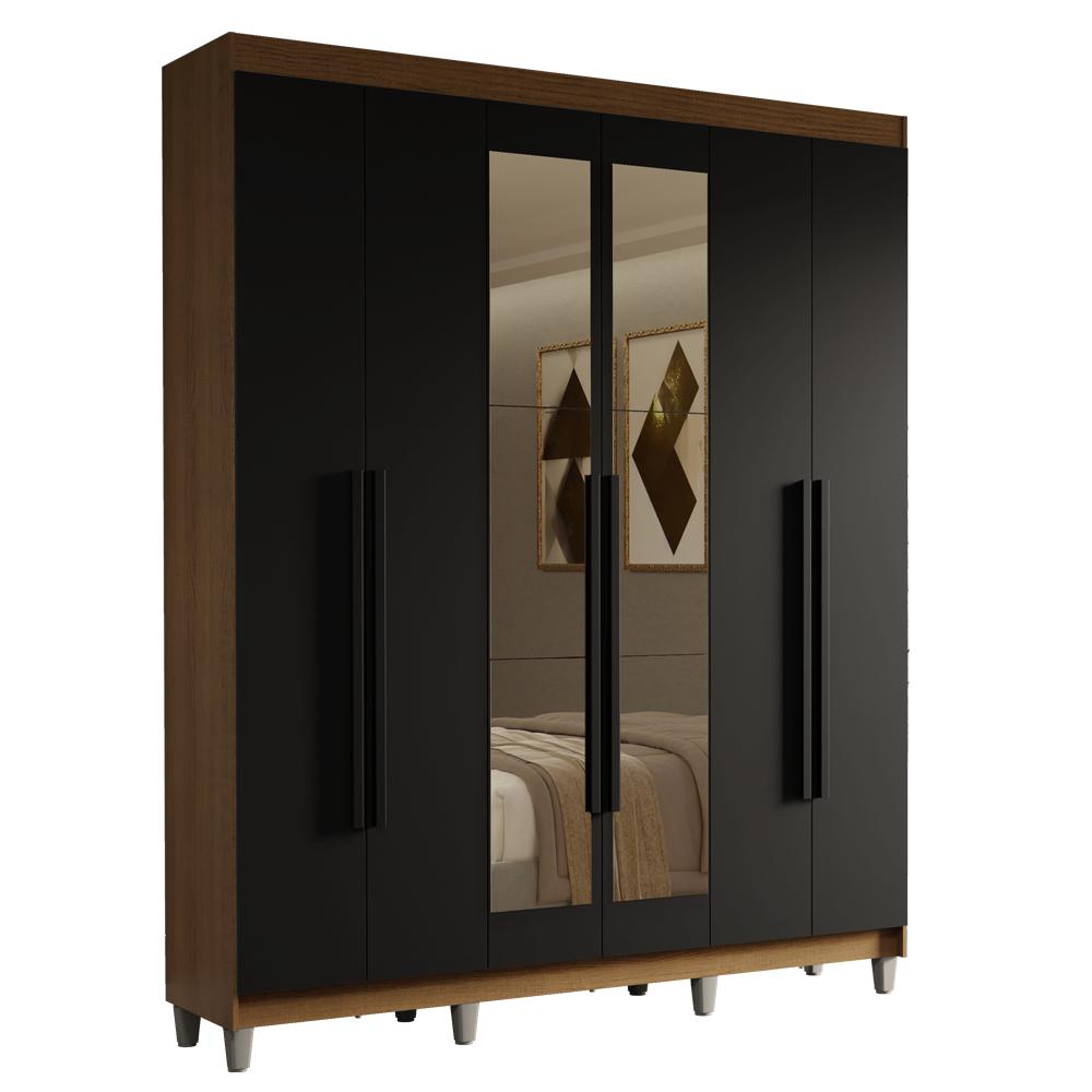 Guarda-Roupa Casal com Pés 6 Portas Batentes com Espelho Rustic/Preto/Preto Saturno Madesa