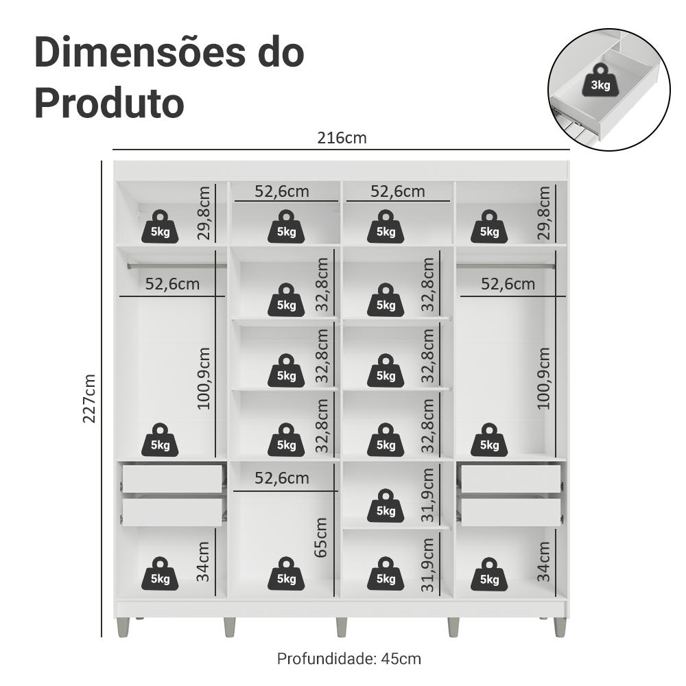 Guarda-Roupa Closet com Pés 4 Gavetas 216cm Branco Venus Madesa