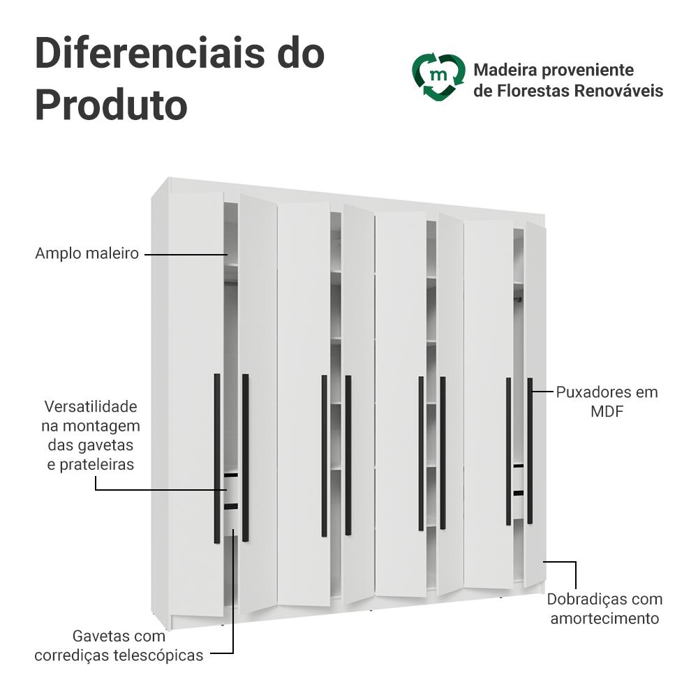 Desenvolvido para quem busca espaço amplo e organização, o Guarda-Roupa Saturno 8 Portas traz funcionalidade e elegância para seu quarto, atendendo todas as suas necessidades.As portas fecham de forma suave e silenciosa, por possuir dobradiças com amortecimento. As gavetas permitem uma abertura completa e o amplo maleiro é perfeito para armazenar itens maiores. O interior do guarda-roupa pode ser personalizado, com a possibilidade de ajustar as gavetas e prateleiras conforme suas necessidades.Possui uma pintura de alta resistência, que garante durabilidade e um acabamento impecável por muito mais tempo. A estrutura e as portas são na coloração Branca e os puxadores na coloração preta. Os puxadores de 80 cm, fabricados em MDF, são um dos grandes diferenciais, trazendo um design alongado e moderno.Essa combinação de elementos faz do Guarda-Roupa Saturno a escolha ideal para quem busca um móvel funcional, com detalhes que fazem toda a diferença.Medidas:- 216 cm de largura- 47 cm de profundidade- 217 cm de alturaO que você recebe:- Um (1) Guarda-Roupa com oito (8) portas batentesCódigo do produto: 1107K54GL2É importante saber:- Material: MDP - Imagens meramente ilustrativas.- A Madesa não disponibiliza serviço de montagem.- O produto segue com manual de instalação e todas as ferragens necessárias para sua montagem.A Madesa se dedica à sustentabilidade com várias iniciativas: temos usina própria que gera energia para uma das fábricas. Priorizamos fornecedores responsáveis com o meio ambiente. Todo o plástico utilizado na produção é reciclado, e as sobras são reaproveitadas. Investimos no desenvolvimento de nossos colaboradores e da comunidade.