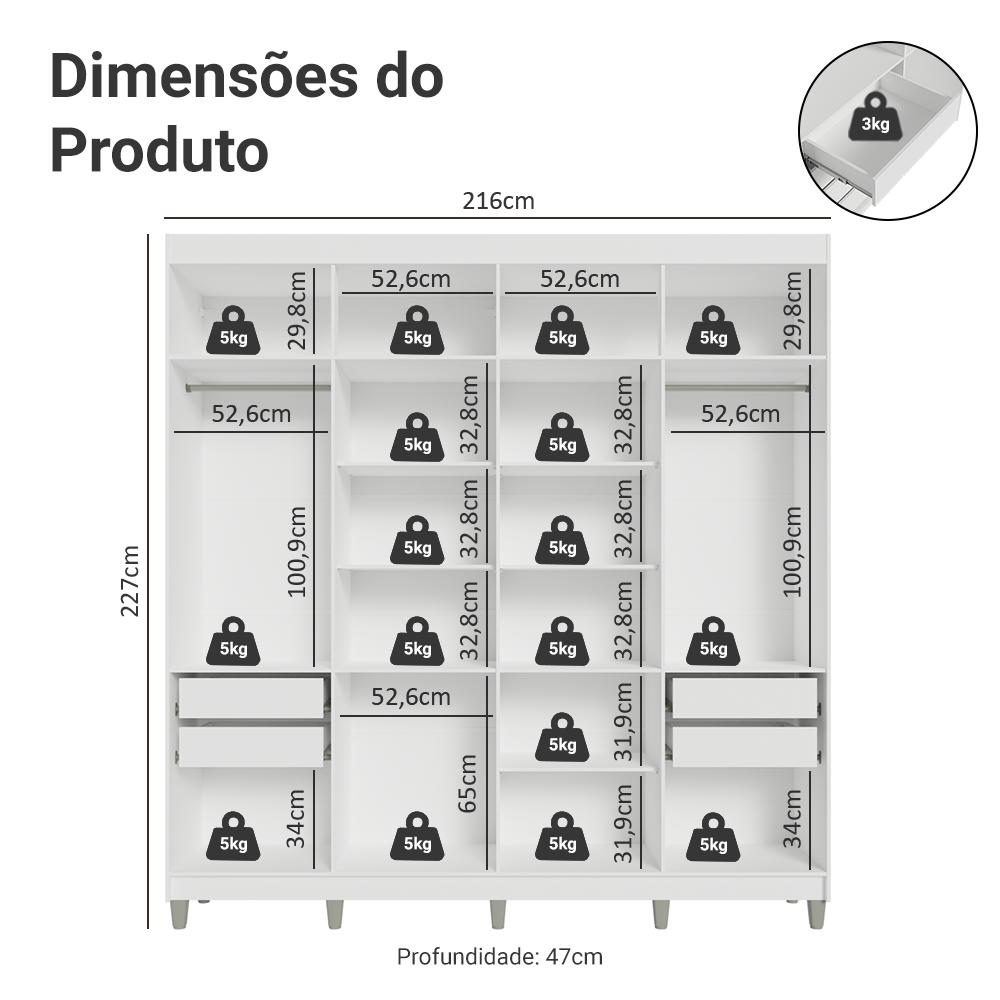 O Guarda-Roupa Netuno transforma a organização do seu quarto, unindo design moderno e soluções inteligentes.As portas contam com dobradiças com amortecimento, garantindo fechamento suave, enquanto as gavetas possuem corrediças que permitem abertura total. O maleiro espaçoso é ideal para itens maiores, e as gavetas e prateleiras ajustáveis permitem personalizar o interior conforme suas necessidades.A estrutura é em Branco e as portas e os puxadores em Preto, criando um visual moderno e elegante. Os puxadores de 80 cm em MDF destacam o design alongado do guarda-roupa, enquanto os pés elevam o móvel, facilitando a limpeza e valorizando o ambiente.O Guarda-Roupa Netuno é a escolha perfeita para quem busca um móvel funcional, espaçoso e cheio de detalhes que fazem toda a diferença no quarto.Medidas:- 216 cm de largura- 47 cm de profundidade- 227 cm de alturaO que você recebe:- Um Guarda-Roupa com oito portas batentesCódigo do produto: 1107K84GL3CPÉ importante saber:- Imagens meramente ilustrativas.- A Madesa não disponibiliza serviço de montagem.- Por segurança, é obrigatório fixar o móvel na parede.- O produto segue com manual de instalação e todas as ferragens necessárias para sua montagem.A Madesa se dedica à sustentabilidade com várias iniciativas: temos uma usina própria que gera energia para uma das fábricas. Priorizamos fornecedores responsáveis com o meio ambiente. Todo o plástico utilizado na produção é reciclado, e as sobras também são reaproveitadas. Investimos no desenvolvimento de nossos colaboradores e em ações que beneficiem a comunidade.