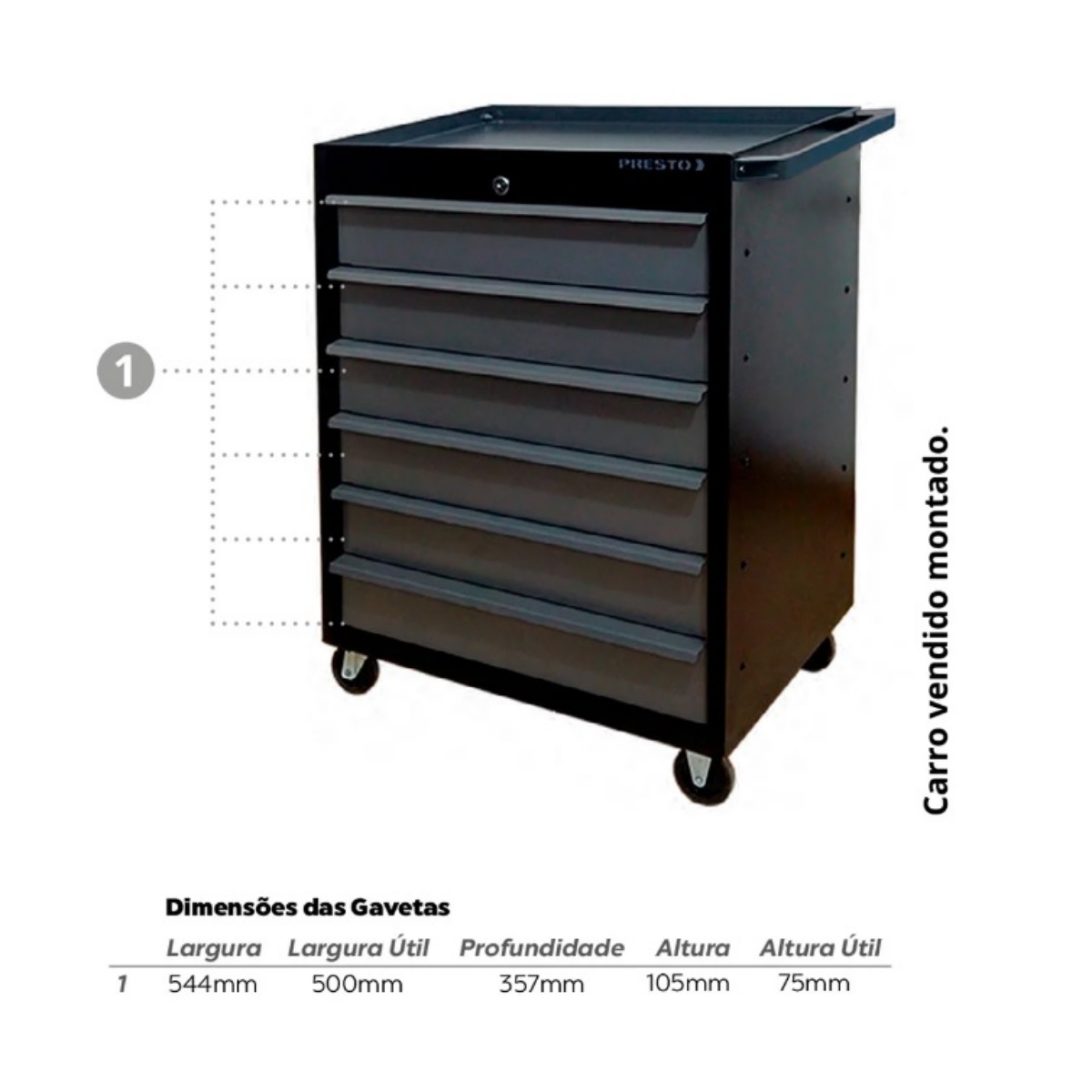 Cód. Fornecedor: 91025Marca: Presto Descrição O Carro para Ferramentas Profissional da Presto com 6 gavetas é robusto e funcional. Tem capacidade de carga de até 250kg distribuídos e permite o acondicionamento e transporte, já que conta com 4 rodízios de 4”, sendo 2 fixos e 2 giratórios com freio.VantagensPrático para expor em ShowroomMaior resistência e durabilidade: tratamento químico antiferruginoso, fosfatizante e pintura eletrostática a póBandeja reforçadaGavetas com corrediças telescópicas de esferasRodízio de 4″Fechamento único para todas gavetas Detalhes Técnicos Largura: 60 +10 cmAltura: 84 cmProfundidade: 40 cmPeso: 39,814kgCarga máxima: 250kg distribuídos