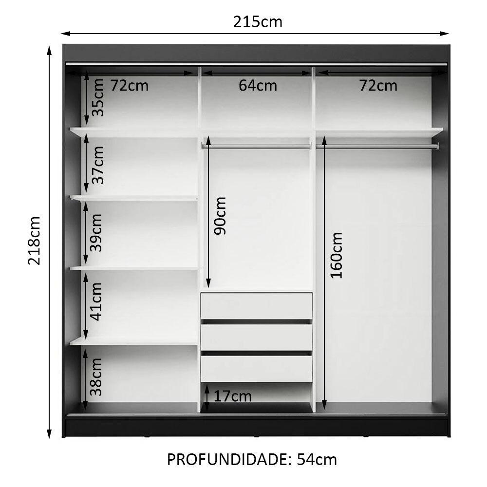 Com tamanho ideal para casal, o Guarda-Roupa Istambul da Madesa possui três portas de correr com deslizamento suave, trilhos em alumínio para maior resistência e dois puxadores externos.Um dos principais diferenciais desta versão são os espelhos, que ampliam o ambiente e são bastante práticos no dia a dia. Internamente, o espaço é ótimo, com diversas prateleiras e nichos, além de três gavetas espaçosas com corrediças metálicas, muito mais seguras e resistentes.Para completar, os dois cabideiros são em alumínio e possuem espaços tanto para roupas curtas quanto mais longas. Ou seja, tem lugar pra organizar tudo: roupas, calçados, malas, travesseiros, edredons e muito mais.O acabamento externo é preto. A parte interna é branca e as portas são em amadeirado Rustic. É feito com a Pintura Poliéster exclusiva da Madesa. Esse processo é ecologicamente correto e conserva o móvel por muito mais tempo.Medidas totais do móvel: 218 cm de altura x 215 cm de largura x 54 cm de profundidade.As imagens são meramente ilustrativas.Itens inclusos:- Três (3) portas de correr com sistema anti-descarrilhamento, sendo uma delas com espelhos- Dois (2) puxadores em alumínio com detalhes em PVC- Três (3) gavetas internas com corrediças metálicas- Dois (2) cabideiros em alumínioCódigo do produto: 1118D81EObs.: A Madesa não disponibiliza serviço de montagem. A embalagem acompanha as ferragens necessárias e o manual com todos os passos para a instalação do produto.1 – O produto é novo ou usado?R.: Todos os produtos da Madesa são novos, enviados da nossa fábrica diretamente para as casas de nossos clientes.2 – O produto vem montado? Se não, vocês realizam a montagem?R.: A Madesa não disponibiliza serviço de montagem. Todos os produtos seguem com manual de instalação e as ferragens necessárias. Alguns produtos possuem vídeo explicando o passo a passo da montagem.3 – Vocês possuem loja física? Posso retirar meu produto em mãos?R.: Não possuímos loja física, apenas loja virtual. Confira as opções de envio ao colocar o seu CEP.4 – Qual é o valor do envio? Posso pagar separadamente?R.: O valor do envio é calculado com base no peso e volume do produto, e no CEP de destino. Você pode calcular o valor e prazo de entrega no simulador.5 – A Madesa entrega em todo Brasil? Como é feita a entrega?R.: Sim, entregamos no Brasil inteiro através de transportadoras parceiras.6 – O produto acompanha Nota Fiscal?R.: Sim, todos os produtos são entregues com suas respectivas notas fiscais.7 – Os produtos possuem garantia?R.: Sim. A Madesa oferece 3 meses de garantia para defeitos de fabricação.A Madesa se dedica à sustentabilidade com várias iniciativas: temos uma usina própria para gerar energia que abastece uma de nossas fábricas. Selecionamos nossos fornecedores, priorizando aqueles que possuem um compromisso com a sustentabilidade e proteção do meio ambiente. Todo o plástico utilizado no setor produtivo é proveniente de reciclagem e as suas sobras são encaminhadas ao fornecedor que os recicla. Também investimos no desenvolvimento contínuo de nossos colaboradores e em ações educacionais que beneficiem a comunidade.
