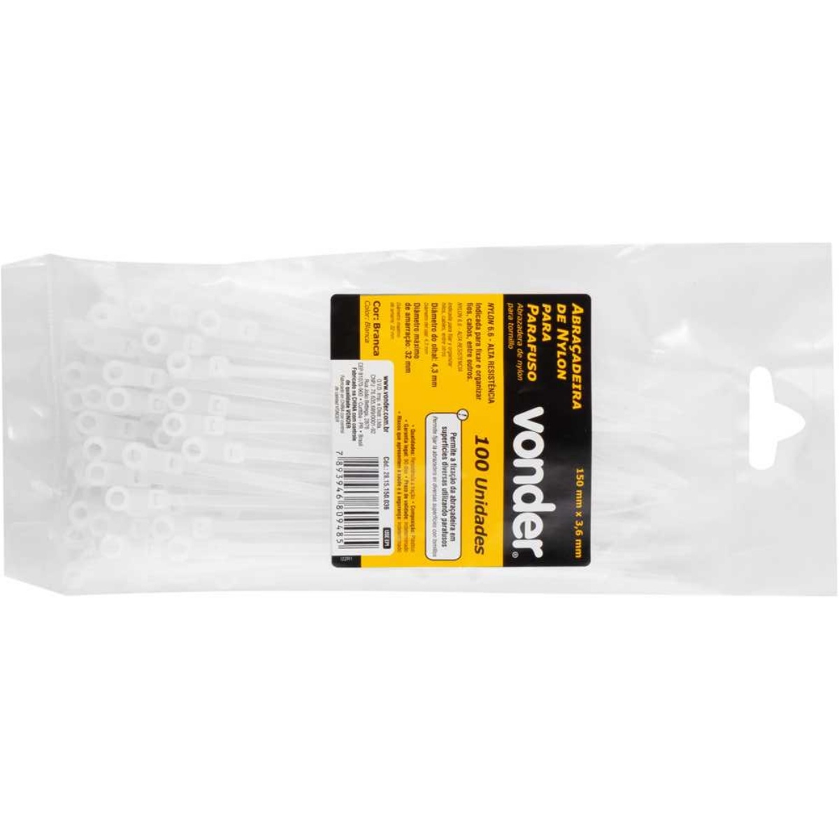 #html-body [data-pb-style=X8XX0OM]{justify-content:flex-start;display:flex;flex-direction:column;background-position:left top;background-size:cover;background-repeat:no-repeat;background-attachment:scroll}Abraçadeira de Nylon Vonder 150 x 3,6 mm Branca com 100 Peças - Vonder Oficial A Abraçadeira de Nylon Vonder 150 x 3,6 mm Branca é a ferramenta indispensável para quem busca organização, praticidade e segurança na fixação de fios, cabos e outros itens. Ideal para uso em diversas situações, desde instalações elétricas até projetos de construção, ela oferece uma solução eficiente e de alta qualidade, perfeita para profissionais e usuários que precisam de fixação durável e confiável. Produzida em Nylon 6.6, um material de alta performance, a abraçadeira Vonder proporciona maior resistência à tração, garantindo que seus cabos e fios fiquem firmemente fixados no lugar, sem risco de deslizamento ou soltura. Esse material também oferece proteção UV, que aumenta a vida útil da abraçadeira, mesmo em ambientes externos ou expostos à luz solar, onde outros materiais poderiam sofrer desgaste rapidamente. Com 150 mm de comprimento e 3,6 mm de largura, a abraçadeira de nylon Vonder é ideal para diversas aplicações, como organização de fios, fixação de cabos e segurança de itens soltos. O diâmetro máximo de amarração de 32 mm é perfeito para diferentes tamanhos de cabos e fios, permitindo a utilização em uma ampla gama de projetos, sejam domésticos, industriais ou comerciais. Especificações- Material (tipo/composição): Nylon 6.6- Cor: Branca- Comprimento nominal: 150 mm- Largura: 3,6 mm- Diâmetro do olhal: 4,3 mm- Diâmetro máximo de amarração: 32 mm- Massa aproximada (peso) (kg): 0,073 kg Itens inclusos- 1 Bolsa plástica com 100 abraçadeiras de nylon Garantia- 03 meses com o fabricante