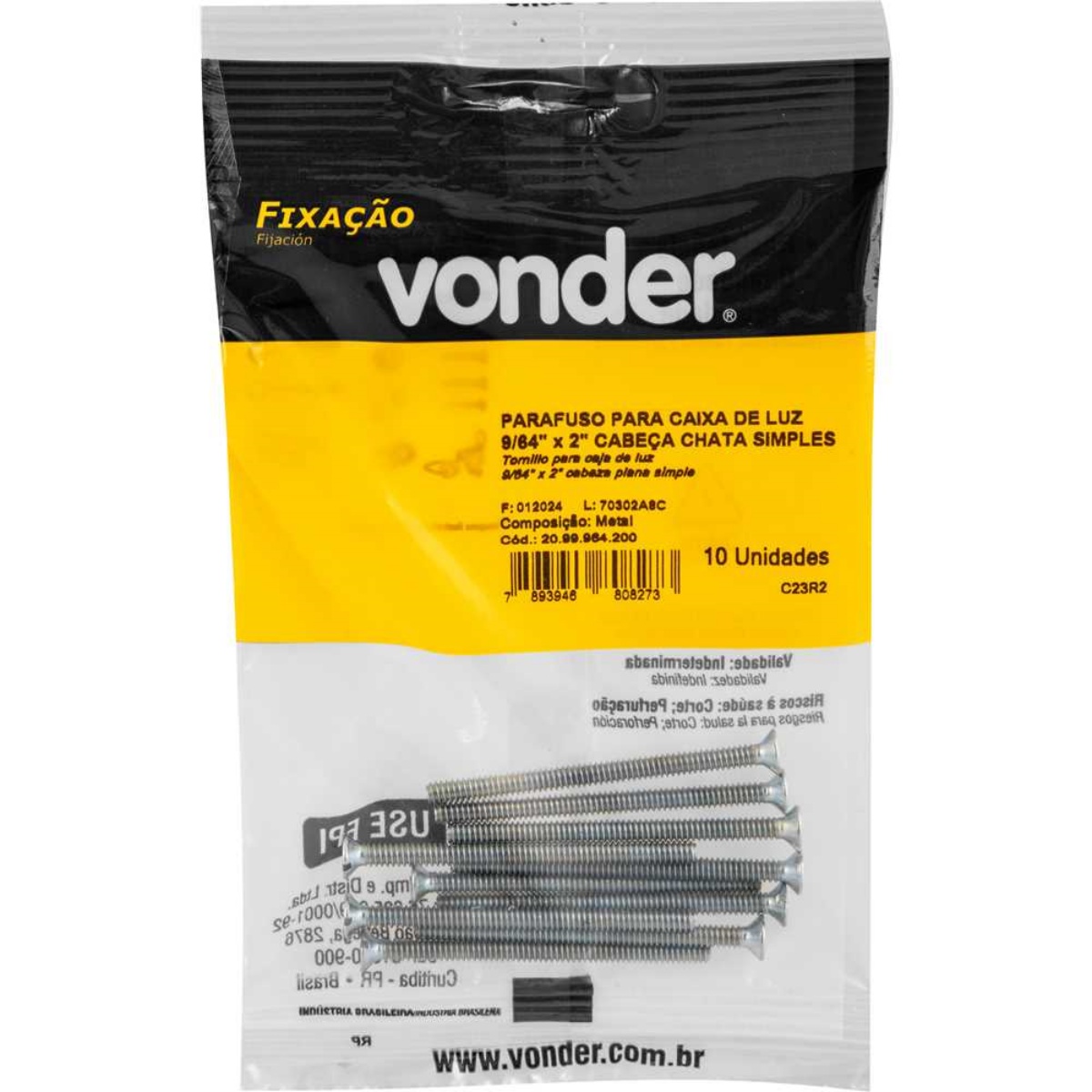 Parafuso Vonder para Caixa de Luz 9/64 x 2" com 10 PeçasO Parafuso para Caixa de Luz Vonder 9/64 x 2" é a solução confiável e eficiente para fixação de caixas de luz embutidas ou aparentes, oferecendo desempenho superior nas mais diversas aplicações elétricas. Com diâmetro de 3,38 mm (9/64") e comprimento total de 50,5 mm (2"), esse parafuso é ideal para encaixe preciso e seguro em caixas padrão, garantindo um aperto firme e compatível com as principais caixas de luz do mercado. Ele possui fenda simples e cabeça chata, facilitando o manuseio com ferramentas convencionais e proporcionando uma fixação alinhada à superfície, o que favorece o acabamento estético da instalação.Produzido em aço carbono de alta resistência e com tratamento galvanizado, o parafuso Vonder se destaca pela durabilidade e resistência à oxidação — fator essencial em ambientes úmidos, como cozinhas, banheiros ou áreas externas cobertas. Além disso, sua conformidade com normas técnicas internacionais como ANSI B18.6.3, ANSI B1.1 e DIN 11 atesta a confiabilidade do produto em projetos elétricos profissionais e residenciais por todo o Brasil.Especificações- Qualificação Técnica- Diâmetro: 3,38 mm - 9/64"- Comprimento total: 50,5 mm - 2"- Tipo de fenda: Fenda simples- Cabeça: Chata- Segue norma(s) (nome/sigla): ANSI B 18.6.3 / ANSE B1.1 / DIN 11- Material (tipo/composição): Aço carbono- Tratamento: Galvanizado- Massa aproximada (peso) (kg): 0,018 kgItens inclusos- 10 parafusos para caixa de luzGarantia- 03 meses com o fabricante