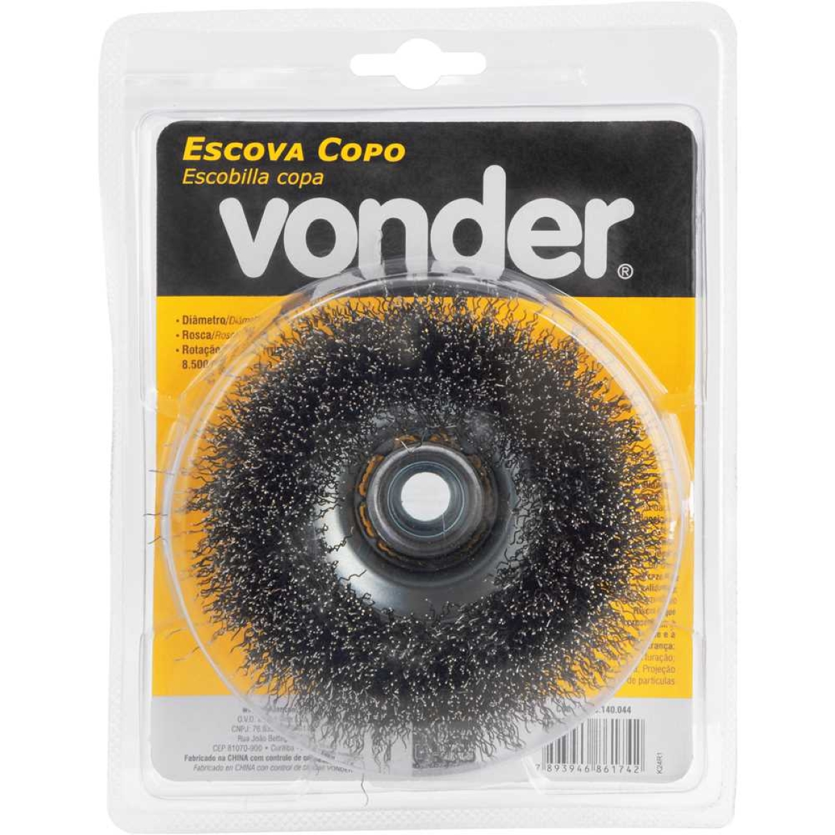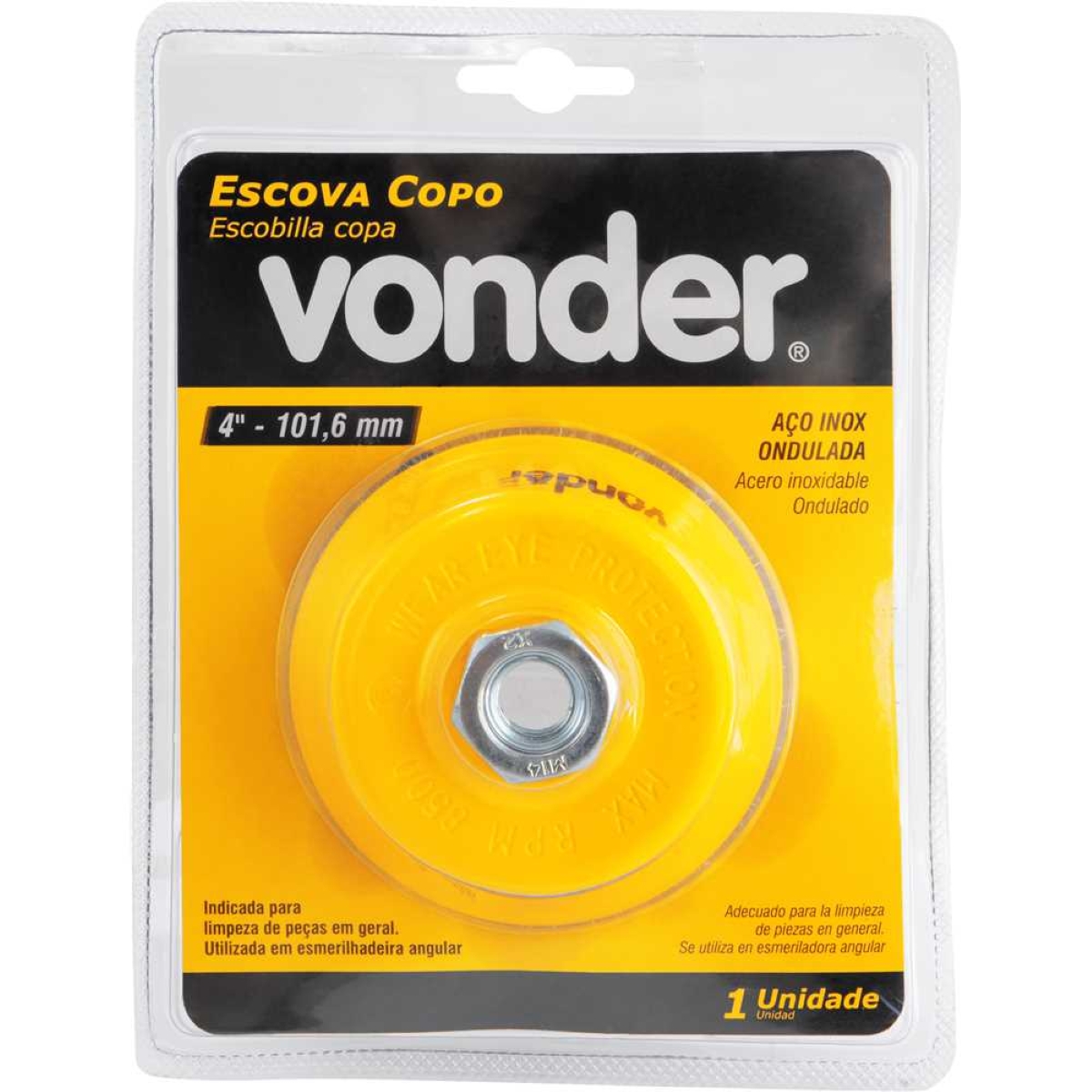 Escova Copo 4'' para Esmerilhadeira: Limpeza e Remoção Eficaz A Escova Copo Vonder de 4'' com rosca M14 é a solução ideal para quem busca eficiência e durabilidade na limpeza e remoção de materiais. Projetada para uso em esmerilhadeiras angulares de 7'', esta escova de aço inox ondulado oferece um poder de remoção superior, tornando-se perfeita para diversas aplicações, desde a preparação de superfícies até a limpeza de peças metálicas. Com capacidade para operar a até 8.500 rpm, garante um trabalho rápido e com excelente acabamento. Sua fabricação em aço inox proporciona alta resistência à oxidação e corrosão, assegurando uma vida útil prolongada. O diâmetro do fio de 0,35 mm garante um desempenho otimizado, adaptando-se a diferentes tipos de materiais e níveis de sujeira. Invista em qualidade e otimize seus trabalhos com a Escova Copo Vonder! Especificações Diâmetro: 4'' (101,6 mm) Diâmetro do fio: 0,35 mm Rotações por minuto (rpm): 8.500/min Rosca: M14 Massa aproximada (peso): 0,475 kg Itens Inclusos 1 Escova tipo copo com rosca Perguntas Frequentes (FAQ) Pergunta: Qual o tipo de esmerilhadeira compatível com esta escova?Resposta: Esta escova é compatível com esmerilhadeiras angulares de 7''. Pergunta: Qual a durabilidade da escova?Resposta: Fabricada em aço inox, a escova possui alta resistência à oxidação e corrosão, garantindo uma longa vida útil. Pergunta: Qual a garantia do produto?Resposta: Garantia legal: 90 dias.