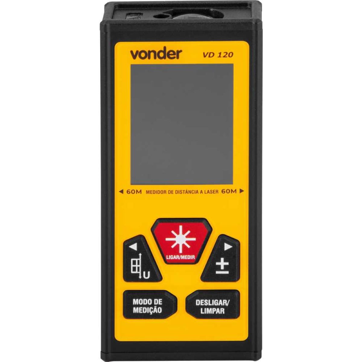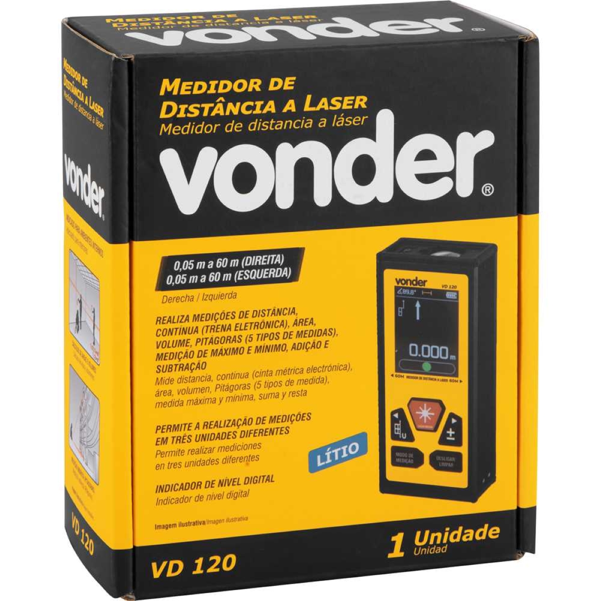 Medidor Laser Distância 120M Vonder VD120: Precisão e Versatilidade para Suas Medições Obtenha resultados precisos e eficientes em suas medições com o Medidor Laser de Distância VD120 da Vonder. Ideal para profissionais e entusiastas, este medidor oferece uma faixa de medição de até 120 metros no modo bilateral, garantindo praticidade em diversos projetos. Com precisão de +/- 2mm, você terá confiança nos resultados obtidos, seja em ambientes internos ou externos. Sua versatilidade se destaca com nove modos de medição diferentes, incluindo distância, contínua, área, volume, Pitágoras, máximo/mínimo, adição/subtração e medição de ângulo e altura. A tela rotacionável e com bloqueio, juntamente com o indicador de nível digital, proporcionam facilidade de leitura e operação. A base magnética na parte traseira permite fixação em superfícies metálicas, liberando suas mãos para maior precisão. Além disso, o desligamento automático economiza energia da bateria, que é recarregável via USB-C. Invista em um medidor laser que combina tecnologia, precisão e conveniência para otimizar suas tarefas de medição. Especificações Modelo: VD 120 Faixa de medição: 0,05 m a 60,0 m (esquerda/direita), 0,05 m a 120 m (bilateral) Precisão: +/- 2 mm Unidades de medida: Sistema métrico, polegada fracionária, pés Comprimento da onda do laser: 630 nm - 670 nm Alimentação: 1 Bateria Íons de Lítio 3,7 V - 850 mAh Itens Inclusos 1 Medidor de distância a laser 1 Cabo USB tipo C 1 Alça para transporte 1 Bateria de íons de lítio 3,7 V 850 mAh 1 Bolsa protetora Perguntas Frequentes (FAQ) Pergunta: Qual a faixa de medição deste medidor?Resposta: A faixa de medição é de 0,05 m a 60,0 m no modo esquerda/direita e de 0,05 m a 120 m no modo bilateral. Pergunta: O medidor possui bateria recarregável?Resposta: Sim, o medidor utiliza uma bateria de íons de lítio 3,7 V - 850 mAh recarregável via cabo USB tipo C (incluso). Pergunta: Quais modos de medição estão disponíveis?Resposta: Este medidor oferece nove modos de medição: distância, contínua, área, volume, Pitágoras (5 tipos), máximo/mínimo, adição/subtração e medição de ângulo e altura. Pergunta: Qual a garantia do produto?Resposta: Garantia legal: 1 ano